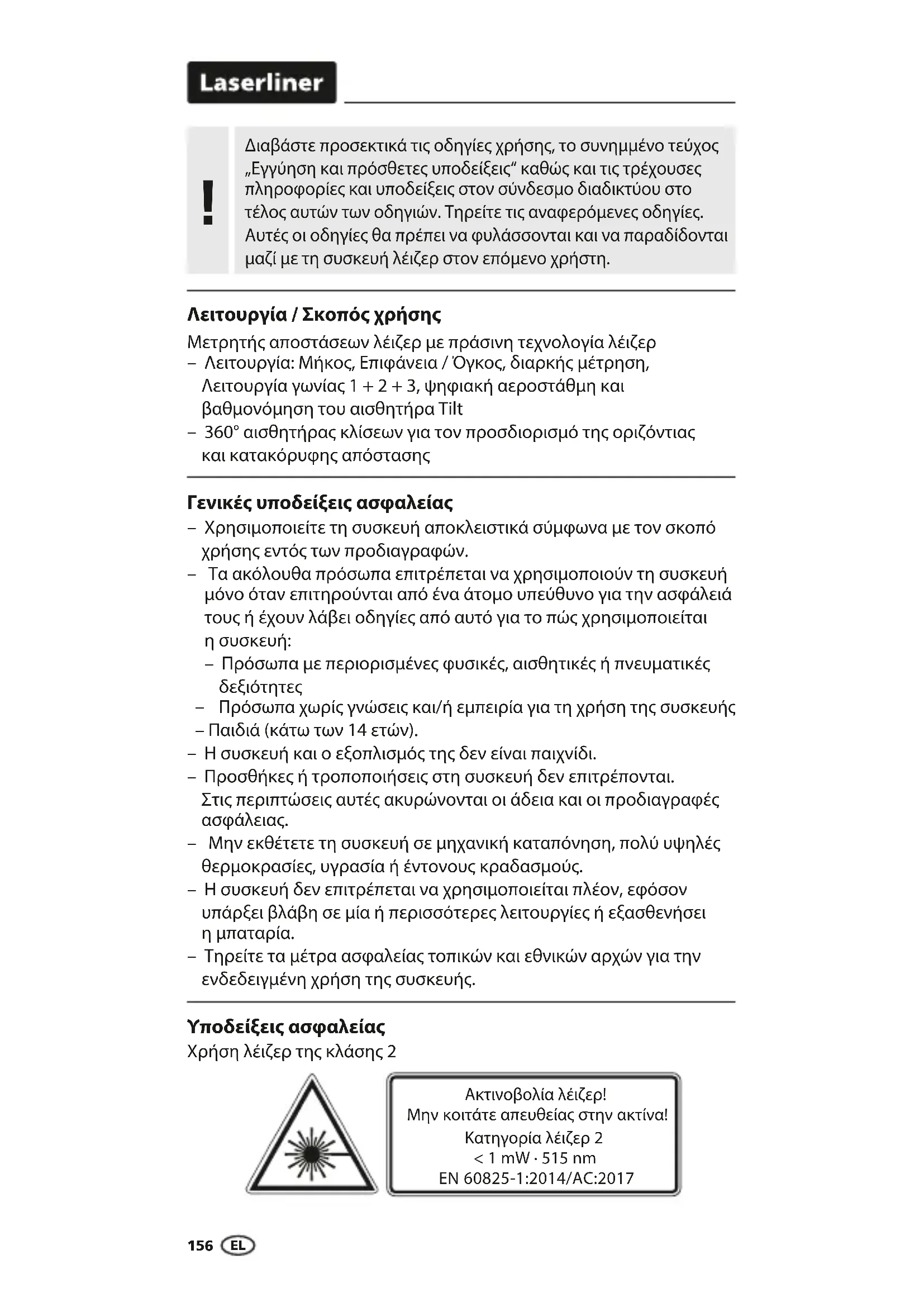 Γενικές υποδείξεις ασφαλείας Οι μονάδες λέιζερ σε έκδοση DLD παρέχουν υψηλή ποιότητα γραμμής και καθαρή και εμφανή εικόνα γραμμής. Σε αντίθεση με τις προηγούμενες εκδόσεις είναι πιο σταθερά σε θερμοκρασιακές μεταβολές και ενεργειακά αποδοτικότερα. Το ανθρώπινο μάτι εμφανίζει μεγαλύτερη ευαισθησία στην περιοχή κυμάτων του πράσινου λέιζερ απ‘ ότι π.χ. στο κόκκινο λέιζερ. Για τον λόγο αυτό εμφανίζεται η πράσινη δίοδος λέιζερ πολύ πιο φωτεινή σε σχέση με την κόκκινη. Τα πράσινα λέιζερ – ειδικά στην έκδοση DLD – προσφέρουν επίσης πλεονεκτήματα σε σχέση με την ορατότητα της γραμμής λέιζερ υπό μη ευνοϊκές συνθήκες. Περ. 6 φορές φωτεινότερο από ένα τυπικό λέιζερ με 630 - 660 nm Υποδείξεις ασφαλείας Αντιμετώπιση της ηλεκτρομαγνητικής ακτινοβολίας – Η συσκευή μέτρησης τηρεί τις προδιαγραφές και οριακές τιμές περί ηλεκτρομαγνητικής συμβατότητας σύμφωνα με την Οδηγία EMC-2014/30/EΕ. – Θα πρέπει να δίνεται προσοχή στους κατά τόπους περιορισμούς της λειτουργίας των συσκευών π.χ. σε νοσοκομεία ή αεροπλάνα., σε πρατήρια καυσίμων, ή κοντά σε άτομα με βηματοδότη. Υπάρχει πιθανότητα εμφάνισης βλαβών ή αρνητικής επίδρασης από και μέσω ηλεκτρονικών συσκευών. – Αν υπάρχουν κοντά υψηλές τάσεις ή υψηλά ηλεκτρομαγνητικά εναλλασσόμενα πεδία μπορεί να επηρεαστεί η ακρίβεια μέτρησης. – Προσοχή: Μην κοιτάτε κατευθείαν στην ακτίνα ή στην αντανάκλασή της. – Μην στρέφετε την ακτίνα του λέιζερ σε άτομα. – Σε περίπτωση πρόσπτωσης ακτίνας λέιζερ κατηγορίας 2 στο μάτι, κλείστε τα μάτια σας και μετακινήστε το κεφάλι αμέσως μακριά από την ακτίνα. – Απαγορεύονται οι τροποποιήσεις (αλλαγές) της διάταξης του λέιζερ. – Ποτέ μην κοιτάτε την ακτίνα λέιζερ ή τις αντανακλάσεις με οπτικές συσκευές (φακός, μικροσκόπιο, κιάλια, …). EL158