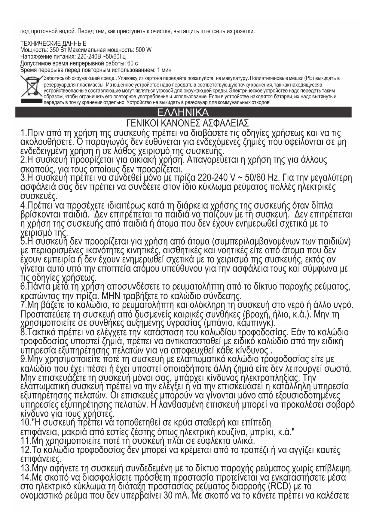 4.Πρέπει να προσέχετε ιδιαιτέρως κατά τη διάρκεια χρήσης της συσκευής όταν δίπλα βρίσκονται παιδιά. Δεν επιτρέπεται τα παιδιά να παίζουν με τη συσκευή. Δεν επιτρέπεται η χρήση της συσκευής από παιδιά ή άτομα που δεν έχουν ενημερωθεί σχετικά με το χειρισμό της. 5.Η συσκευή δεν προορίζεται για χρήση από άτομα (συμπεριλαμβανομένων των παιδιών) με περιορισμένες ικανότητες κινητικές, αισθητικές και νοητικές είτε από άτομα που δεν έχουν εμπειρία ή δεν έχουν ενημερωθεί σχετικά με το χειρισμό της συσκευής, εκτός αν γίνεται αυτό υπό την εποπτεία ατόμου υπεύθυνου για την ασφάλεια τους και σύμφωνα με τις οδηγίες χρήσεως. 6.Πάντα μετά τη χρήση αποσυνδέσετε το ρευματολήπτη από το δίκτυο παροχής ρεύματος, κρατώντας την πρίζα. ΜΗΝ τραβήξετε το καλώδιο σύνδεσης. 7.Μη βάζετε το καλώδιο, το ρευματολήπτη και ολόκληρη τη συσκευή στο νερό ή άλλο υγρό. Προστατεύετε τη συσκευή από δυσμενείς καιρικές συνθήκες (βροχή, ήλιο, κ.ά.). Μην τη χρησιμοποιείτε σε συνθήκες αυξημένης υγρασίας (μπάνιο, κάμπινγκ). 8.Τακτικά πρέπει να ελέγχετε την κατάσταση του καλωδίου τροφοδοσίας. Εάν το καλώδιο τροφοδοσίας υποστεί ζημιά, πρέπει να αντικατασταθεί με ειδικό καλώδιο από την ειδική υπηρεσία εξυπηρέτησης πελατών για να αποφευχθεί κάθε κίνδυνος . 9.Μην χρησιμοποιείτε ποτέ τη συσκευή με ελαττωματικό καλώδιο τροφοδοσίας είτε με καλώδιο που έχει πέσει ή έχει υποστεί οποιαδήποτε άλλη ζημιά είτε δεν λειτουργεί σωστά. Μην επισκευάζετε τη συσκευή μόνοι σας, υπάρχει κίνδυνος ηλεκτροπληξίας. Την ελαττωματική συσκευή πρέπει να την ελέγξει ή να την επισκευάσει η κατάλληλη υπηρεσία εξυπηρέτησης πελατών. Οι επισκευές μπορούν να γίνονται μόνο από εξουσιοδοτημένες υπηρεσίες εξυπηρέτησης πελατών. Η λανθασμένη επισκευή μπορεί να προκαλέσει σοβαρό κίνδυνο για τους χρήστες. 10."Η συσκευή πρέπει να τοποθετηθεί σε κρύα σταθερή και επίπεδη επιφάνεια, μακριά από εστίες ζέστης όπως ηλεκτρική κουζίνα, μπρίκι, κ.ά." 11.Μη χρησιμοποιείτε ποτέ τη συσκευή πλάι σε εύφλεκτα υλικά. 12.Το καλώδιο τροφοδοσίας δεν μπορεί να κρέμεται από το τραπέζι ή να αγγίζει καυτές επιφάνειες. 13.Μην αφήνετε τη συσκευή συνδεδεμένη με το δίκτυο παροχής ρεύματος χωρίς επίβλεψη. 14.Με σκοπό να διασφαλίσετε πρόσθετη προστασία προτείνεται να εγκαταστήσετε μέσα στο ηλεκτρικό κύκλωμα τη διάταξη προστασίας ρεύματος διαρροής (RCD) με το ονομαστικό ρεύμα που δεν υπερβαίνει 30 mA. Με σκοπό να το κάνετε πρέπει να καλέσετετον ειδικό ηλεκτρικό.