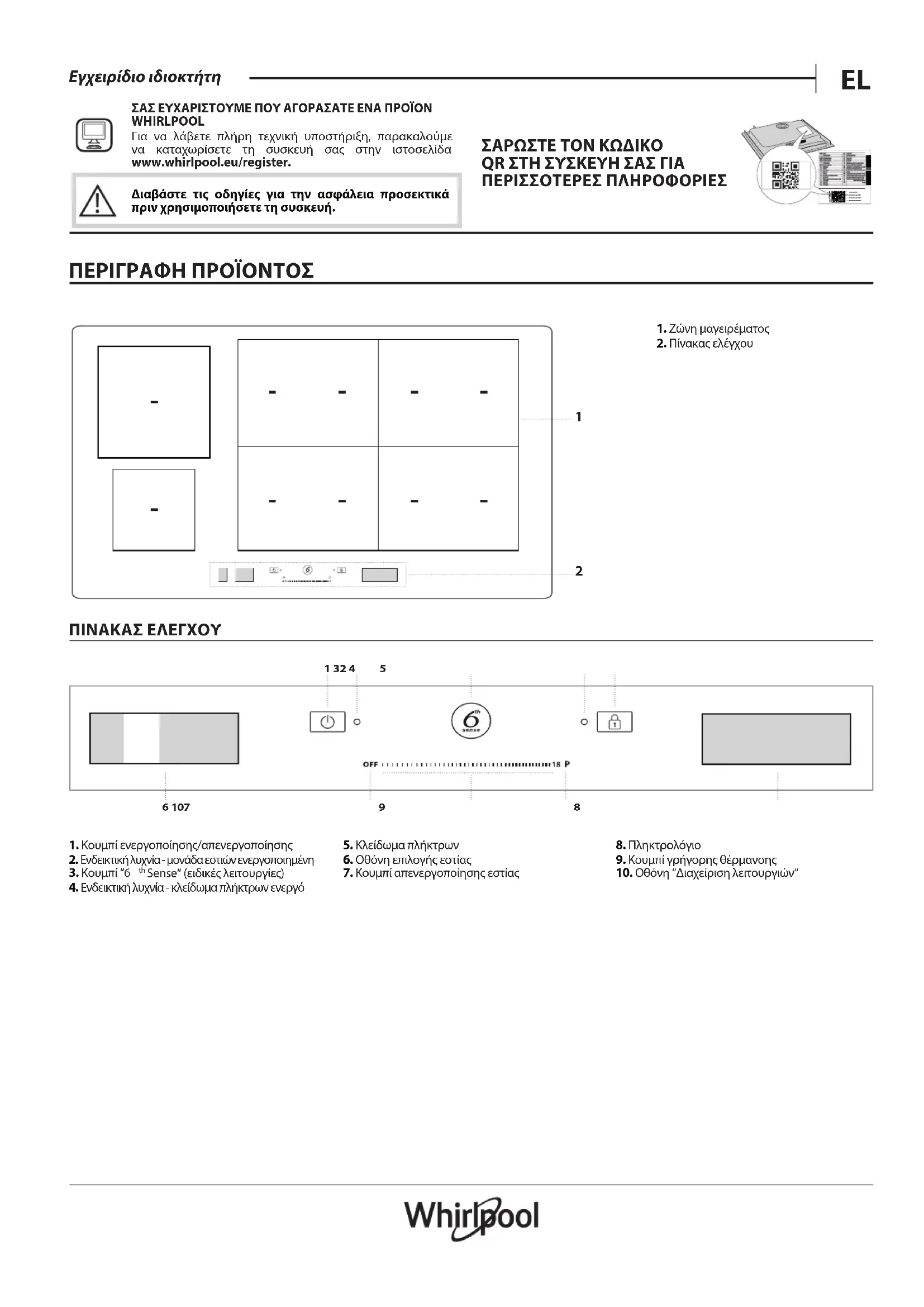 ΣΑΣ ΕΥΧΑΡΙΣΤΟΥΜΕ ΠΟΥ ΑΓΟΡΑΣΑΤΕ ΕΝΑ ΠΡΟΪΟΝ WHIRLPOOL Για να λάβετε πλήρη τεχνική υποστήριξη, παρακαλούμε να καταχωρίσετε τη συσκευή σας στην ιστοσελίδα www.whirlpool.eu/register. ΣΑΡΩΣΤΕ ΤΟΝ ΚΩΔΙΚΟ QR ΣΤΗ ΣΥΣΚΕΥΗ ΣΑΣ ΓΙΑ ΠΕΡΙΣΣΟΤΕΡΕΣ ΠΛΗΡΟΦΟΡΙΕΣ