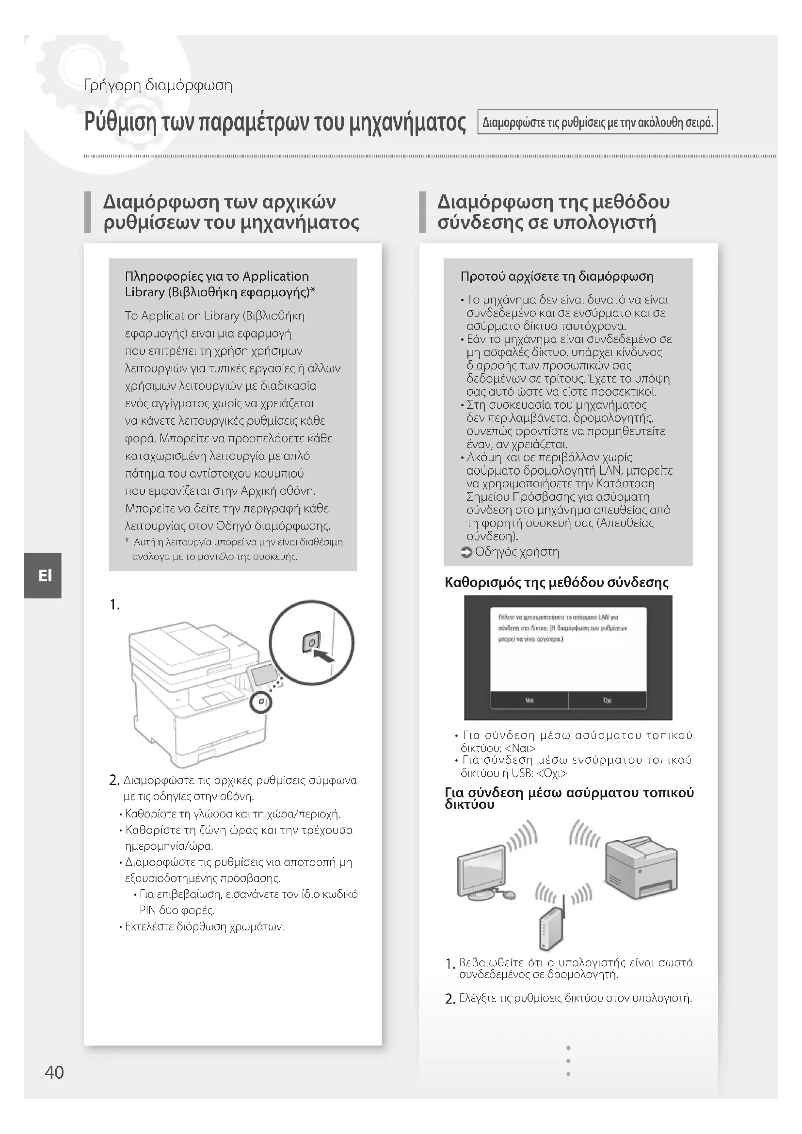 σελίδα42«Εγκατάστασητουλογισμικού»Ολοκληρώθηκε η διαμόρφωση των αρχικών ρυθμίσεων.Αν το μηχάνημα διαθέτει λειτουργία φαξ, προχωρήστε στη διαμόρφωση των ρυθμίσεων φαξ. σελίδα 43 Για σύνδεση μέσω ενσύρματου τοπικού