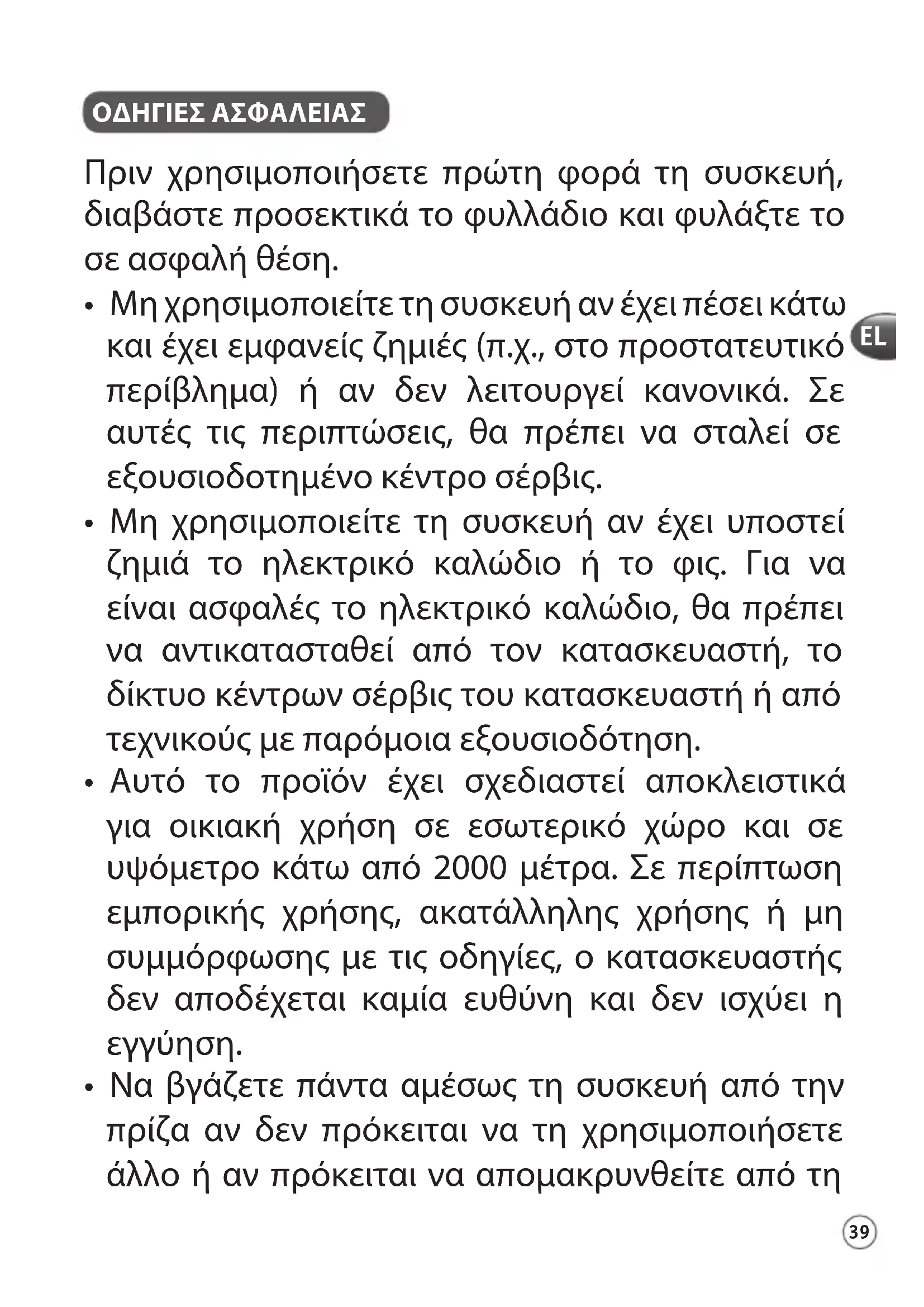 ΟΔΗΓΙΕΣ ΑΣΦΑΛΕΙΑΣ Πριν χρησιμοποιήσετε πρώτη φορά τη συσκευή, διαβάστε προσεκτικά το φυλλάδιο και φυλάξτε το σε ασφαλή θέση.