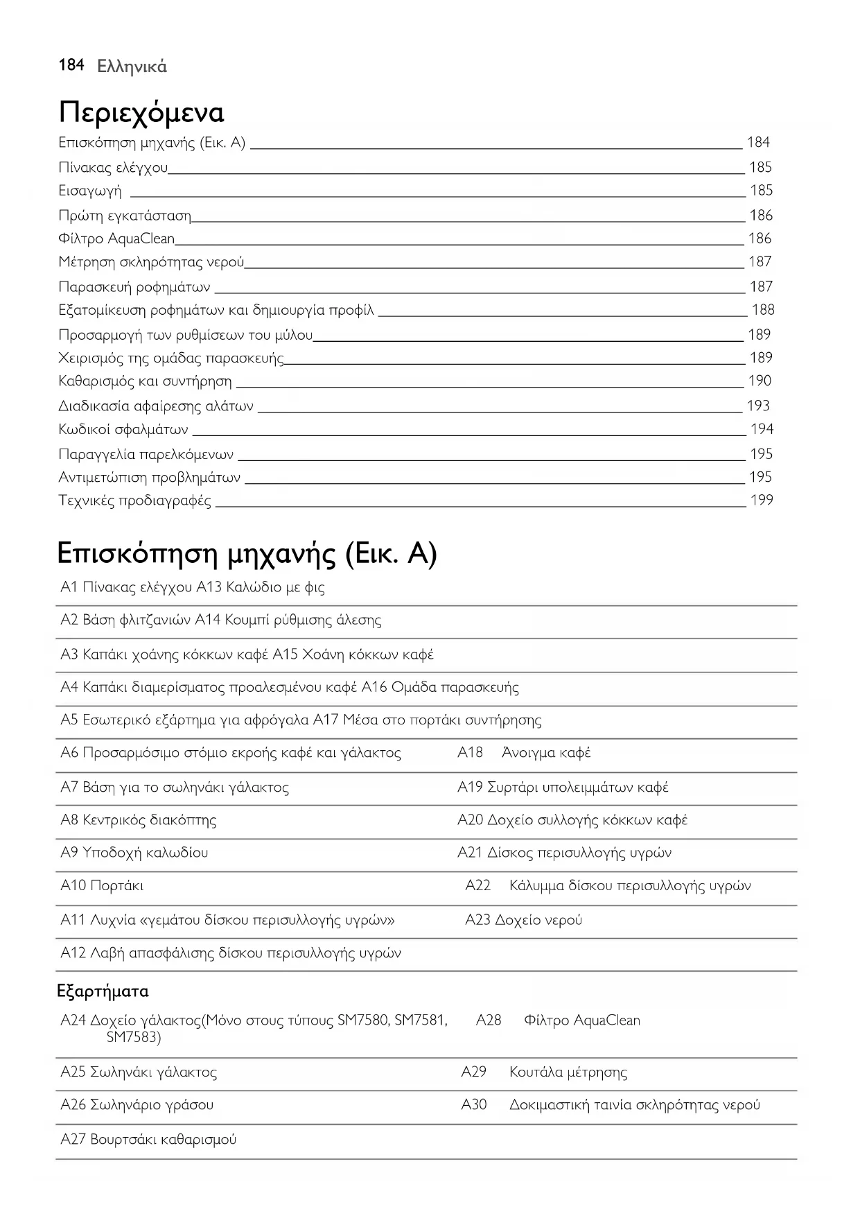 A24 Δοχείο γάλακτος(Μόνο στους τύπους SM7580, SM7581, SM7583) A28 Φίλτρο AquaClean A25 Σωληνάκι γάλακτος A29 Κουτάλα μέτρησης A26 Σωληνάριο γράσου A30 Δοκιμαστική ταινία σκληρότητας νερού