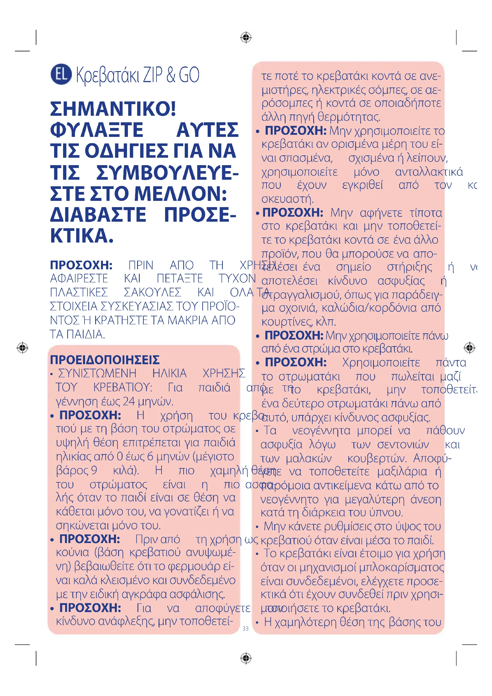 - ΠΡΟΣΟΧΗ: Χρησιμοποιείτε πάντα το στρωματάκι που πωλείται μαζί με το κρεβατάκι, μην τοποθετείτε έναδεύτεροστρωματάκιπάνωαπό αυτό,υπάρχεικίνδυνοςασφυξίας.