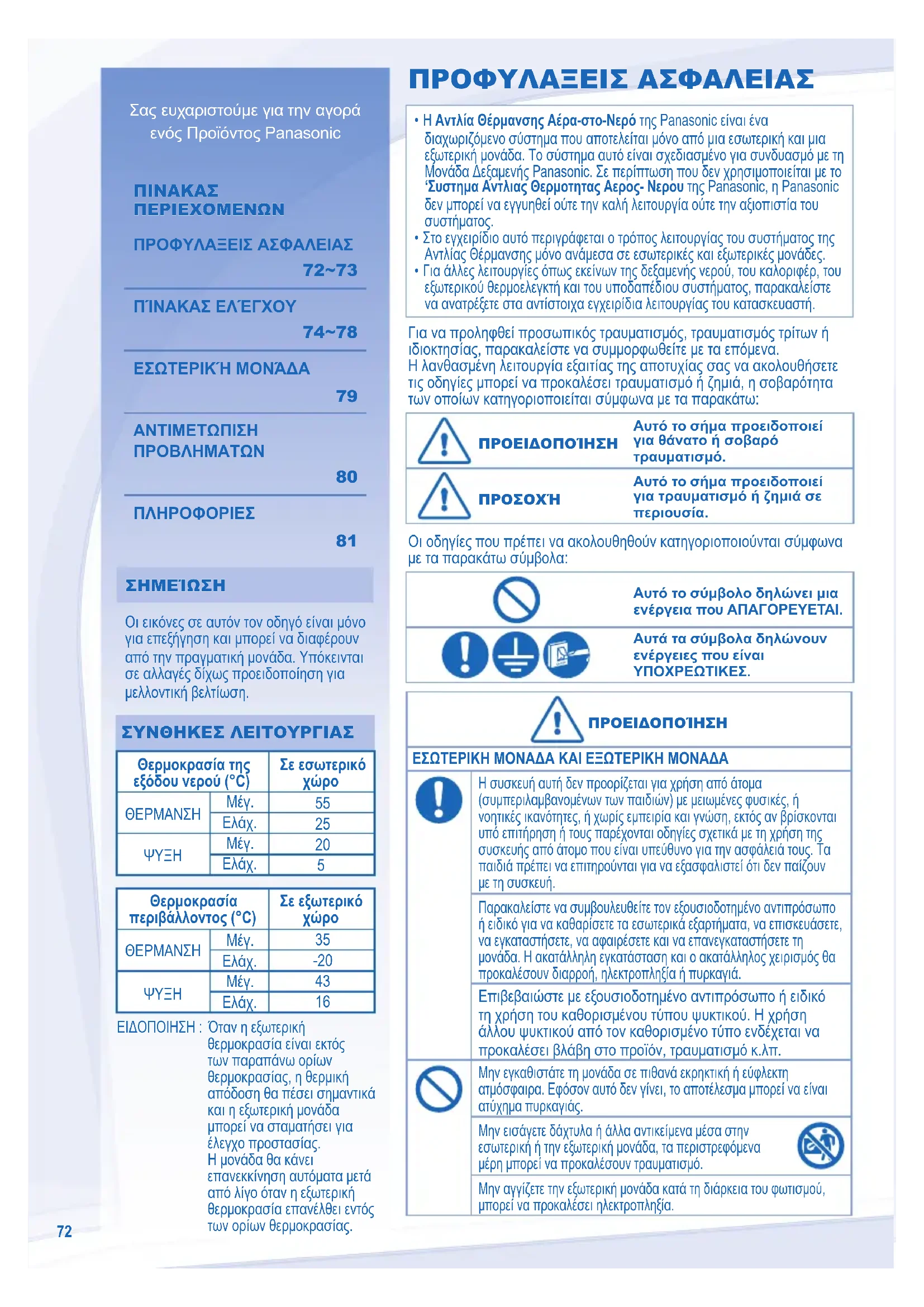 - Για άλλες λειτουργίες όπως εκείνων της δεξαμενής νερού, του καλοριφέρ, του εξωτερικού θερμοελεγκτή και του υποδαπέδιου συστήματος, παρακαλείστε να ανατρέξετε στα αντίστοιχα εγχειρίδια λειτουργίας του κατασκευαστή. ΠΡΟΦΥΛΑΞΕΙΣ ΑΣΦΑΛΕΙΑΣ Σας ευχαριστούμε για την αγορά ενός Προϊόντος Panasonic