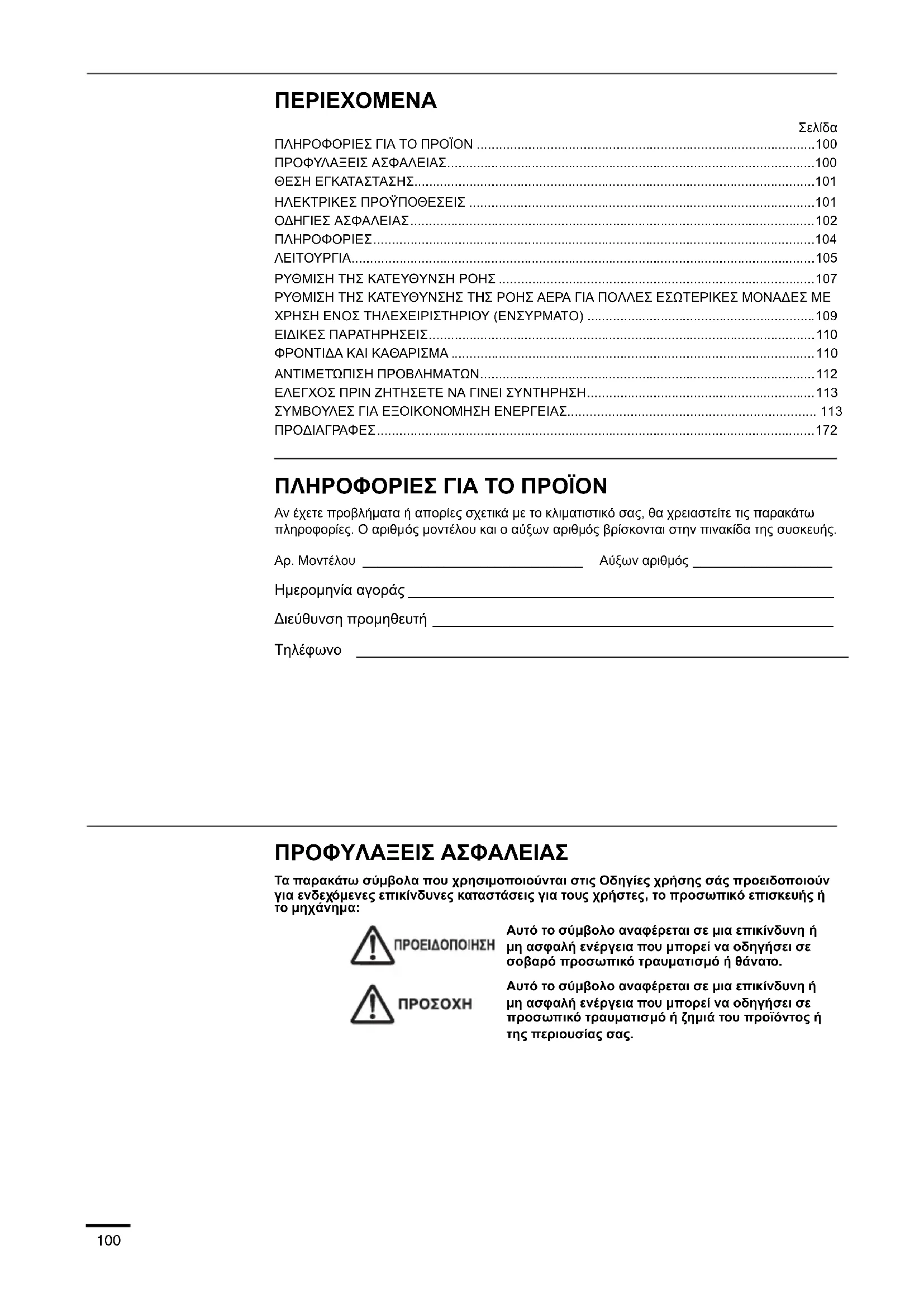- ΠΡΟΔΙΑΓΡΑΦΕΣ ΠΛΗΡΟΦΟΡΙΕΣ ΓΙΑ ΤΟ ΠΡΟΪΟΝ Αν έχετε προβλήματα ή απορίες σχετικά με το κλιματιστικό σας, θα χρειαστείτε τις παρακάτω πληροφορίες. Ο αριθμός μοντέλου και ο αύξων αριθμός βρίσκονται στην πινακίδα της συσκευής. Αρ. Μοντέλου ______________________________ Αύξων αριθμός ___________________ Ημερομηνία αγοράς ____________________________________________________ Διεύθυνση προμηθευτή _________________________________________________ Τηλέφωνο ____________________________________________________________ ΠΡΟΦΥΛΑΞΕΙΣ ΑΣΦΑΛΕΙΑΣ Τα παρακάτω σύμβολα που χρησιμοποιούνται στις Οδηγίες χρήσης σάς προειδοποιούν για ενδεχόμενες επικίνδυνες καταστάσεις για τους χρήστες, το προσωπικό επισκευής ή το μηχάνημα: Αυτό το σύμβολο αναφέρεται σε μια επικίνδυνη ή μη ασφαλή ενέργεια που μπορεί να οδηγήσει σε σοβαρό προσωπικό τραυματισμό ή θάνατο. Αυτό το σύμβολο αναφέρεται σε μια επικίνδυνη p. 172