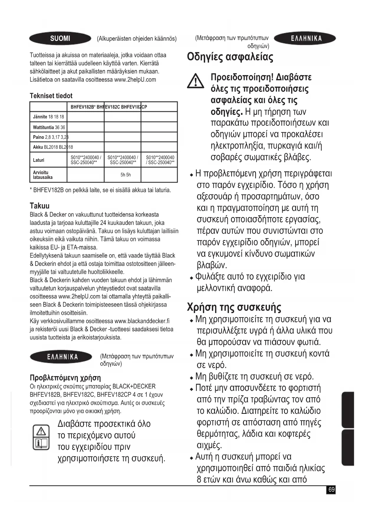 Σύμβολα επάνω στο φορτιστή Πριν χρησιμοποιήσετε τη συσκευή διαβάστε προσεκτικά ολόκληρο το εγχειρίδιο. Αυτό το εργαλείο φέρει διπλή μόνωση και επομένως δεν απαιτείται καλώδιο γείωσης. Ελέγχετε πάντα ότι η παροχή ρεύματος αντιστοιχεί στην τάση που αναφέρεται στην πινακίδα στοιχείων. Η βάση φόρτισης προορίζεται για χρήση μόνο σε εσωτερικούς χώρους.Ετικέτες πάνω στη συσκευήΑυτή η συσκευή φέρει τα παρακάτω προειδοποιητικά σύμβολα μαζί με τον κωδικό ημερομηνίας Πριν χρησιμοποιήσετε τη συσκευή διαβάστε προσεκτικά ολόκληρο το εγχειρίδιο S010Q 23 S010**2400040 / SSC-250040** BHFEV182B, BHFEV182C, BHFEV182CP χρησιμοποιείτε φορτιστή S010**2400040 / SSC-250040**ΧαρακτηριστικάΑυτό το εργαλείο διαθέτει μερικά από ή όλα τα παρακάτω χαρακτηριστικά. 1. Κουμπί On/Off (ενεργοποίησης/απενεργοποίησης) 2. Διακόπτης ισχύος 3 ταχυτήτων2a. Κουμπί ενεργοποίησης περιστροφικής βούρτσας 3. Ένδειξη κατάστασης φόρτισης 3a. Αισθητήρας φίλτρου 4. Μπαταρία 18 V (διατίθεται με μονάδες BHFEV182C, BHFEV182CP) 5. Φορτιστής 18V τύπου κυπέλλου και σταθμός φόρτισης (διατίθενται με μονάδες BHFEV182C, BHFEV182CP) 6. Δοχείο συλλογής σκόνης αφαιρούμενο με ανύψωση, με αναδευτήρα φίλτρου 7. Θυρίδα δοχείου συλλογής σκόνης 8. Κεφαλή δαπέδου 9. Σωλήνας επέκτασης 10. Εργαλείο αξεσουάρ 2 σε 1 (διατίθεται για παραγγελία μέσω του τμήματος σέρβις)72 (Μετάφραση των πρωτότυπων οδηγιών)