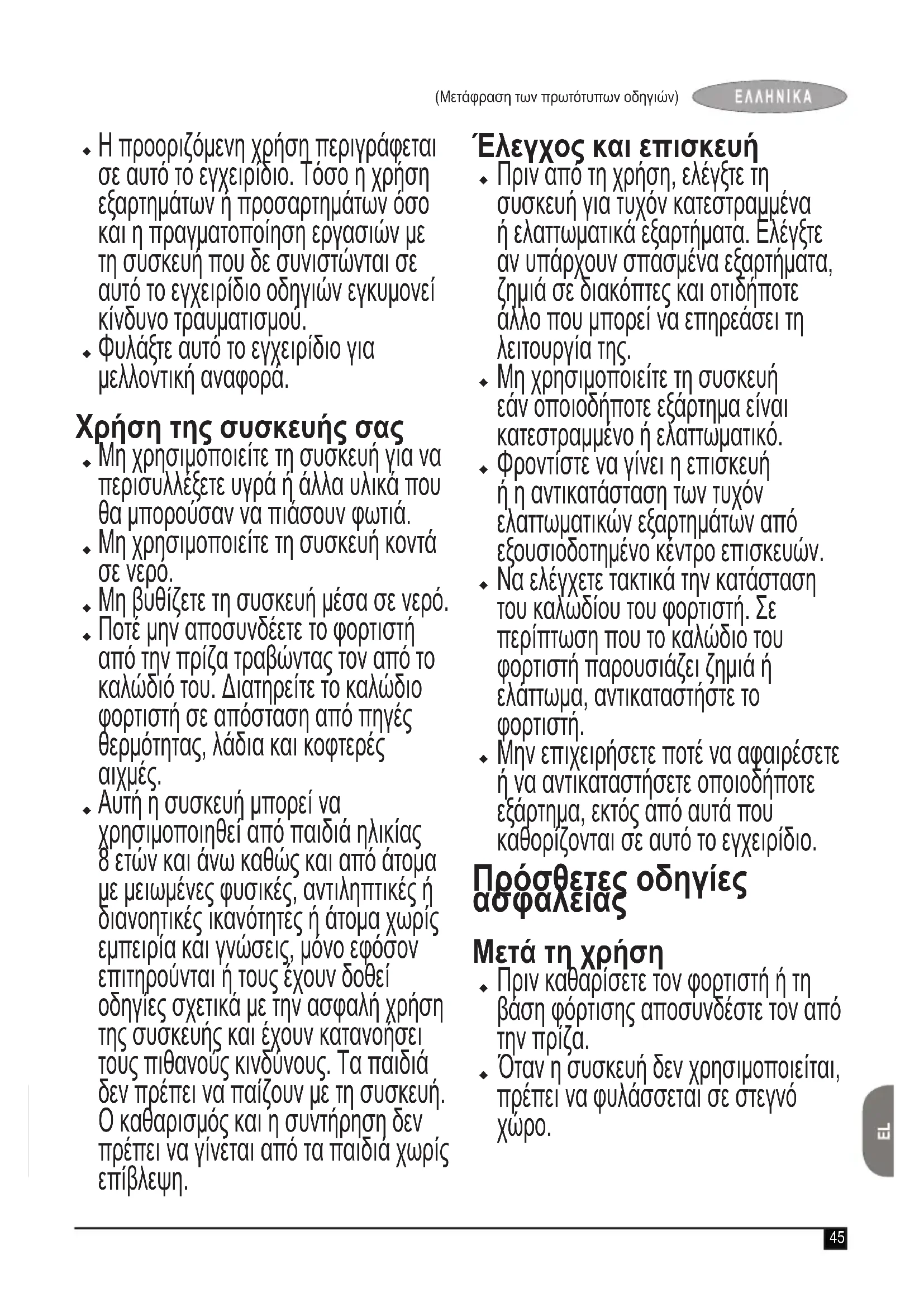 Αυτή η συσκευή μπορεί να χρησιμοποιηθεί από παιδιά ηλικίας 8 ετών και άνω καθώς και από άτομα με μειωμένες φυσικές, αντιληπτικές ή διανοητικές ικανότητες ή άτομα χωρίς εμπειρία και γνώσεις, μόνο εφόσον επιτηρούνται ή τους έχουν δοθεί οδηγίες σχετικά με την ασφαλή χρήση της συσκευής και έχουν κατανοήσει τους πιθανούς κινδύνους. Τα παιδιά δεν πρέπει να παίζουν με τη συσκευή. Ο καθαρισμός και η συντήρηση δεν πρέπει να γίνεται από τα παιδιά χωρίς