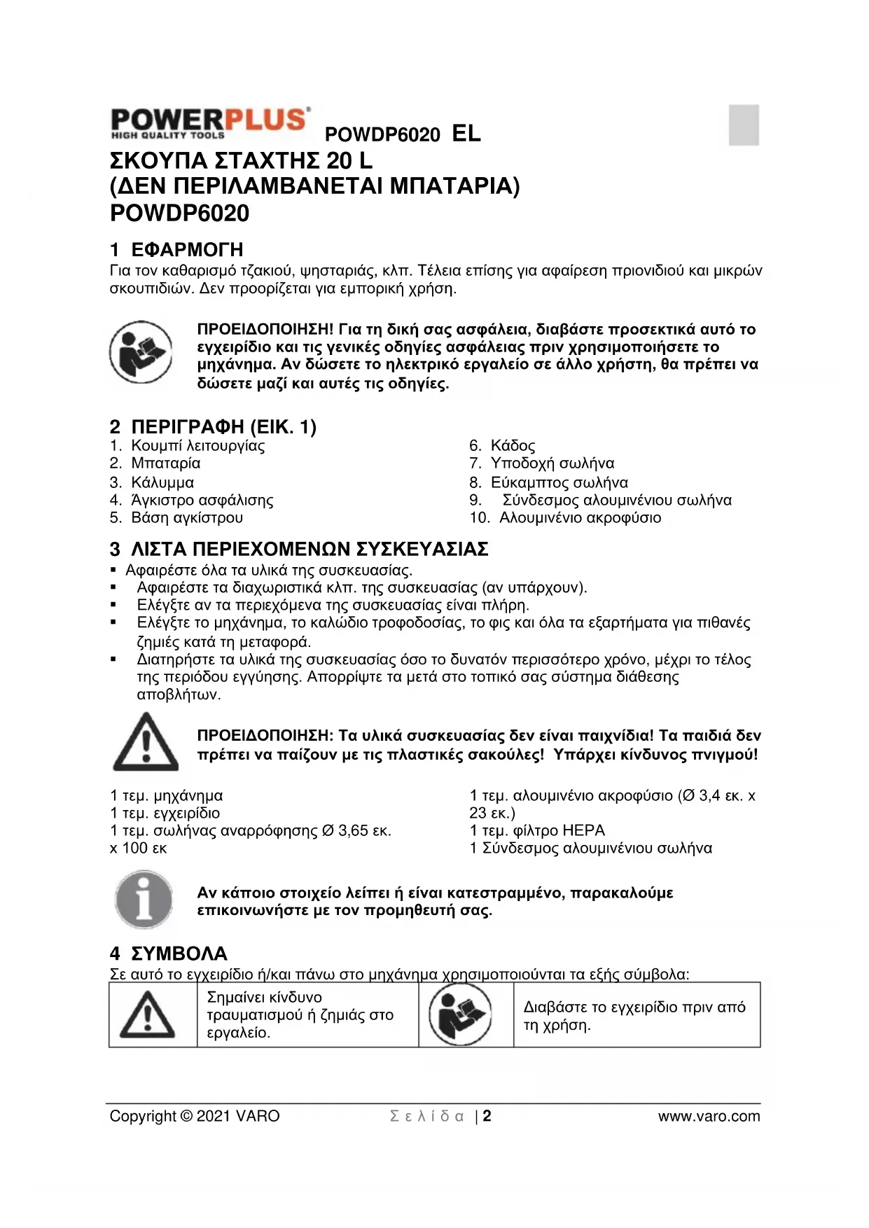 Διαβάστε το εγχειρίδιο πριν από τη χρήση.POWDP6020 EL Copyright © 2021 VARO Σ ε λ ί δ α | 3 www.varo.com