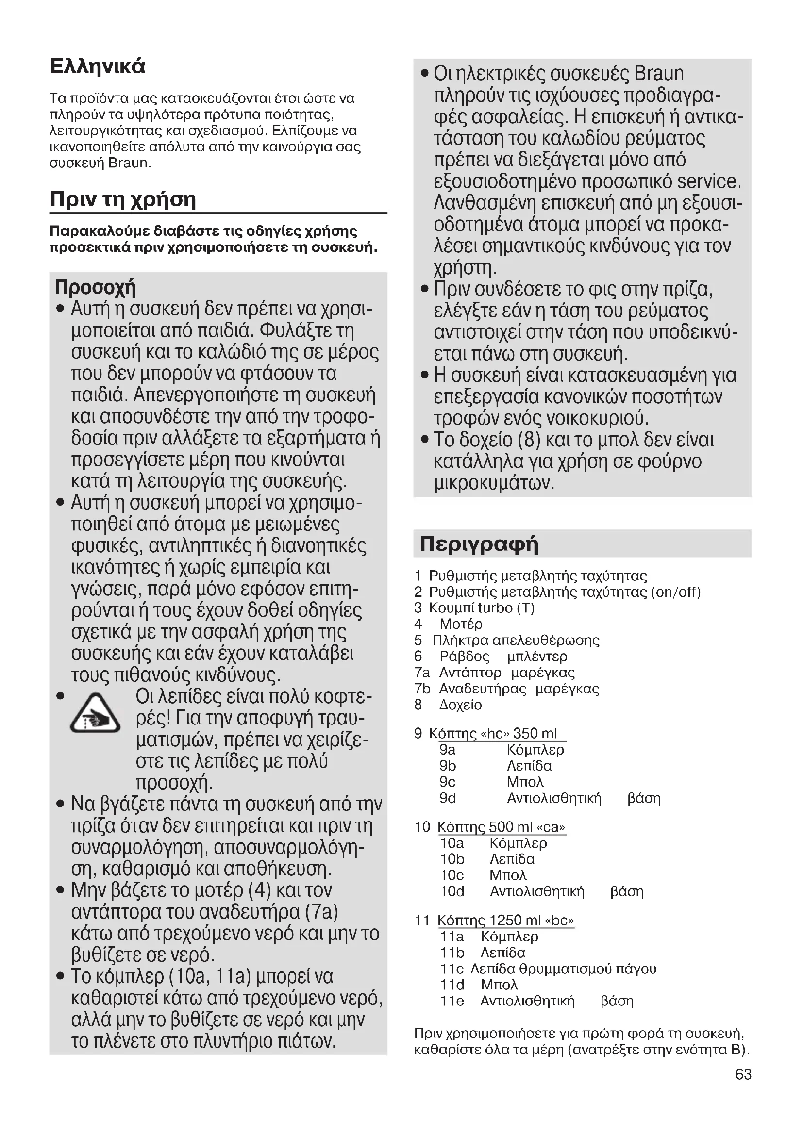 1 Ρυθμιστής μεταβλητής ταχύτητας 2 Ρυθμιστής μεταβλητής ταχύτητας (on/off) 3 Κουμπί turbo (T) 4 Μοτέρ 5 Πλήκτρα απελευθέρωσης 6 Ράβδος μπλέντερ 7a Αντάπτορ μαρέγκας 7b Αναδευτήρας μαρέγκας 8 Δοχείο 9 Κόπτης «hc» 350 ml 9a Κόμπλερ 9b Λεπίδα 9c Μπολ 9d Αντιολισθητική βάση 10 Κόπτης 500 ml «ca» 10a Κόμπλερ 10b Λεπίδα 10c Μπολ 10d Αντιολισθητική βάση 11 Κόπτης 1250 ml «bc» 11a Κόμπλερ 11b Λεπίδα 11c Λεπίδα θρυμματισμού πάγου 11d Μπολ 11e Αντιολισθητική βάση Πριν χρησιμοποιήσετε για πρώτη φορά τη συσκευή, καθαρίστε όλα τα μέρη (ανατρέξτε στην ενότητα B). 5722111864_MQ5000-MQ5045_INT_S6-80.indd 63 30.09.15 11:1464 Ρύθμιση της ταχύτητας Όταν ενεργοποιείτε το κουμπί μεταβλητής ταχύτητας (2), η ταχύτητα επεξεργασίας αντιστοιχεί στη ρύθμιση του ρυθμιστή μεταβλητής ταχύτητας. Όσο πιο υψηλή είναι η ρύθμιση, τόσο πιο γρήγορα γίνεται η κοπή. Μπορείτε να ρυθμίσετε την ταχύτητα εύκολα κατά τη διάρκεια της λειτουργίας στρέφοντας το ρυθμιστή ταχύτητας χρησιμοποιώντας τον αντίχειρα ή το δείκτη σας. Ωστόσο, η μέγιστη ταχύτητα επεξεργασίας μπορεί μόνο να επιτευχθεί πιέζοντας το κουμπί turbo (3). Μπορείτε επίσης να χρησιμοποιήσετε το κουμπί turbo για στιγμιαία δυνατή λειτουργία χωρίς να πρέπει να χειριστείτε το ρυθμιστή ταχύτητας. Μπλέντερ χειρός Το μπλέντερ χειρός είναι απόλυτα κατάλληλο για την παρασκευή ντιπ, σάλτσας, σούπας, μαγιονέζας και παιδικής τροφής καθώς επίσης και για την ανάμειξη ποτών και μιλκ σέικ.