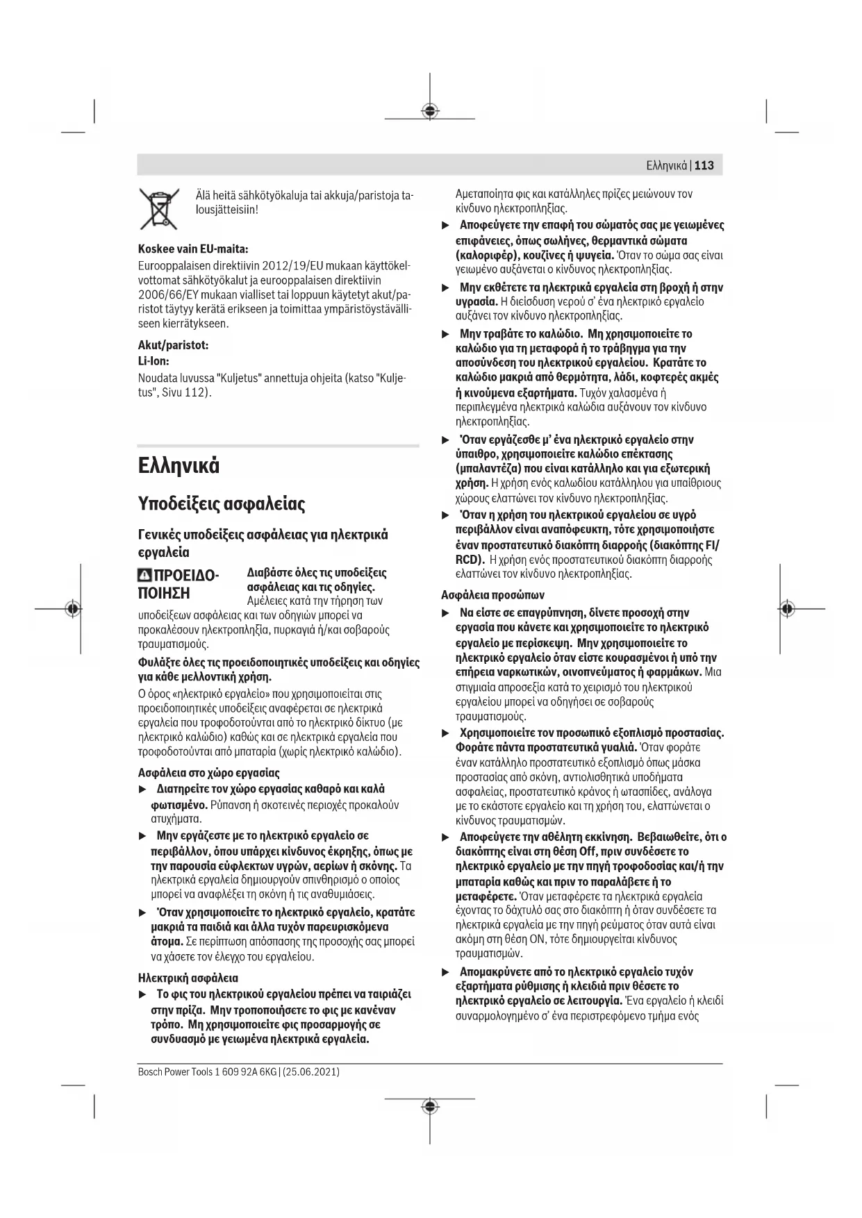 u Μην εργάζεστε με το ηλεκτρικό εργαλείο σε περιβάλλον, όπου υπάρχει κίνδυνος έκρηξης, όπως με την παρουσία εύφλεκτων υγρών, αερίων ή σκόνης. Τα ηλεκτρικά εργαλεία δημιουργούν σπινθηρισμό ο οποίος μπορεί να αναφλέξει τη σκόνη ή τις αναθυμιάσεις. u Όταν χρησιμοποιείτε το ηλεκτρικό εργαλείο, κρατάτε μακριά τα παιδιά και άλλα τυχόν παρευρισκόμενα άτομα. Σε περίπτωση απόσπασης της προσοχής σας μπορεί να χάσετε τον έλεγχο του εργαλείου. Ηλεκτρική ασφάλεια u Το φις του ηλεκτρικού εργαλείου πρέπει να ταιριάζει στην πρίζα. Μην τροποποιήσετε το φις με κανέναν τρόπο. Μη χρησιμοποιείτε φις προσαρμογής σε συνδυασμό με γειωμένα ηλεκτρικά εργαλεία. Αμεταποίητα φις και κατάλληλες πρίζες μειώνουν τον κίνδυνο ηλεκτροπληξίας. u Αποφεύγετε την επαφή του σώματός σας με γειωμένες επιφάνειες, όπως σωλήνες, θερμαντικά σώματα (καλοριφέρ), κουζίνες ή ψυγεία. Όταν το σώμα σας είναι γειωμένο αυξάνεται ο κίνδυνος ηλεκτροπληξίας. u Μην εκθέτετε τα ηλεκτρικά εργαλεία στη βροχή ή στην υγρασία. Η διείσδυση νερού σ’ ένα ηλεκτρικό εργαλείο αυξάνει τον κίνδυνο ηλεκτροπληξίας. u Μην τραβάτε το καλώδιο. Μη χρησιμοποιείτε το καλώδιο για τη μεταφορά ή το τράβηγμα για την αποσύνδεση του ηλεκτρικού εργαλείου. Κρατάτε το καλώδιο μακριά από θερμότητα, λάδι, κοφτερές ακμές ή κινούμενα εξαρτήματα. Τυχόν χαλασμένα ή περιπλεγμένα ηλεκτρικά καλώδια αυξάνουν τον κίνδυνο ηλεκτροπληξίας. u Όταν εργάζεσθε μ’ ένα ηλεκτρικό εργαλείο στην ύπαιθρο, χρησιμοποιείτε καλώδιο επέκτασης (μπαλαντέζα) που είναι κατάλληλο και για εξωτερική χρήση. Ηχρήση ενός καλωδίου κατάλληλου για υπαίθριους χώρους ελαττώνει τον κίνδυνο ηλεκτροπληξίας. u Όταν η χρήση του ηλεκτρικού εργαλείου σε υγρό περιβάλλον είναι αναπόφευκτη, τότε χρησιμοποιήστε έναν προστατευτικό διακόπτη διαρροής (διακόπτηςFI/ RCD). Ηχρήση ενός προστατευτικού διακόπτη διαρροής ελαττώνει τον κίνδυνο ηλεκτροπληξίας. Ασφάλεια προσώπων u Να είστε σε επαγρύπνηση, δίνετε προσοχή στην εργασία που κάνετε και χρησιμοποιείτε το ηλεκτρικό εργαλείο με περίσκεψη. Μην χρησιμοποιείτε το ηλεκτρικό εργαλείο όταν είστε κουρασμένοι ή υπό την επήρεια ναρκωτικών, οινοπνεύματος ή φαρμάκων. Μια στιγμιαία απροσεξία κατά το χειρισμό του ηλεκτρικού εργαλείου μπορεί να οδηγήσει σε σοβαρούς τραυματισμούς. u Χρησιμοποιείτε τον προσωπικό εξοπλισμό προστασίας. Φοράτε πάντα προστατευτικά γυαλιά. Όταν φοράτε έναν κατάλληλο προστατευτικό εξοπλισμό όπως μάσκα προστασίας από σκόνη, αντιολισθητικά υποδήματα ασφαλείας, προστατευτικό κράνος ή ωτασπίδες, ανάλογα με το εκάστοτε εργαλείο και τη χρήση του, ελαττώνεται ο κίνδυνος τραυματισμών. u Αποφεύγετε την αθέλητη εκκίνηση. Βεβαιωθείτε, ότι ο διακόπτης είναι στη θέση Off, πριν συνδέσετε το ηλεκτρικό εργαλείο με την πηγή τροφοδοσίας και/ή την μπαταρία καθώς και πριν το παραλάβετε ή το μεταφέρετε. Όταν μεταφέρετε τα ηλεκτρικά εργαλεία έχοντας το δάχτυλό σας στο διακόπτη ή όταν συνδέσετε τα ηλεκτρικά εργαλεία με την πηγή ρεύματος όταν αυτά είναι ακόμη στη θέση ΟΝ, τότε δημιουργείται κίνδυνος τραυματισμών. u Απομακρύνετε από το ηλεκτρικό εργαλείο τυχόν εξαρτήματα ρύθμισης ή κλειδιά πριν θέσετε το ηλεκτρικό εργαλείο σε λειτουργία. Ένα εργαλείο ή κλειδί συναρμολογημένο σ’ ένα περιστρεφόμενο τμήμα ενός Bosch Power Tools 1 609 92A 6KG | (25.06.2021)114 | Ελληνικά ηλεκτρικού εργαλείου μπορεί να οδηγήσει σε τραυματισμούς. u Προσέχετε πως 
