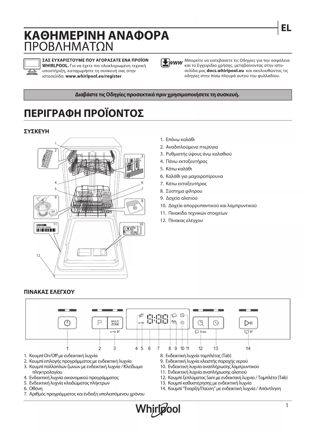 ΠΕΡΙΓΡΑΦΗ ΠΡΟΪΟΝΤΟΣ 1. Επάνω καλάθι 2. Αναδιπλούμενα πτερύγια3. Ρυθμιστής ύψους άνω καλαθιού4. Πάνω εκτοξευτήρας5. Κάτω καλάθι6. Καλάθι για μαχαιροπίρουνα7. Κάτω εκτοξευτήρας8. Σύστημα φίλτρου9. Δοχείο αλατιού10. Δοχεία απορρυπαντικού και λαμπρυντικού11. Πινακίδα τεχνικών στοιχείων12. Πίνακας ελέγχου1. Κουμπί On/O με ενδεικτική λυχνία2. Κουμπί επιλογής προγράμματος με ενδεικτική λυχνία3. Κουμπί πολλαπλών ζωνών με ενδεικτική λυχνία / Κλείδωμα πληκτρολογίου4. Ενδεικτική λυχνία οικονομικού προγράμματος5. Ενδεικτική λυχνία κλειδώματος πλήκτρων6. Οθόνη7. Αριθμός προγράμματος και ένδειξη υπολειπόμενου χρόνου8. Ενδεικτική λυχνία ταμπλέτας (Tab)9. Ενδεικτική λυχνία κλειστής παροχής νερού10. Ενδεικτική λυχνία αναπλήρωσης λαμπρυντικού11. Ενδεικτική λυχνία αναπλήρωσης αλατιού12. Κουμπί ξεπλύματος Sani με ενδεικτική λυχνία / Ταμπλέτα (Tab)13. Κουμπί καθυστέρησης με ενδεικτική λυχνία14. Κουμπί “Έναρξη/Παύση” με ενδεικτική λυχνία / Απάντληση ΚΑΘΗΜΕΡΙΝΗ ΑΝΑΦΟΡΑ ΠΡΟΒΛΗΜΑΤΩΝ ΠΙΝΑΚΑΣ ΕΛΕΓΧΟΥ Διαβάστε τις Οδηγίες προσεκτικά πριν χρησιμοποιήσετε τη συσκευή. ΣΑΣ ΕΥΧΑΡΙΣΤΟΥΜΕ ΠΟΥ ΑΓΟΡΑΣΑΤΕ ΕΝΑ ΠΡΟΪΟΝ WHIRLPOOL. Για να έχετε πιο ολοκληρωμένη τεχνική υποστήριξη, καταχωρήστε τη συσκευή σας στηνιστοσελίδα: www.whirlpool.eu/registerΜπορείτε να κατεβάσετε τις Οδηγίες για την ασφάλεια και το Εγχειρίδιο χρήσης, μεταβαίνοντας στην ιστο-σελίδα μας docs.whirlpool.eu και ακολουθώντας τις οδηγίες στην πίσω πλευρά αυτού του φυλλαδίου.0000 000 00000 Service: