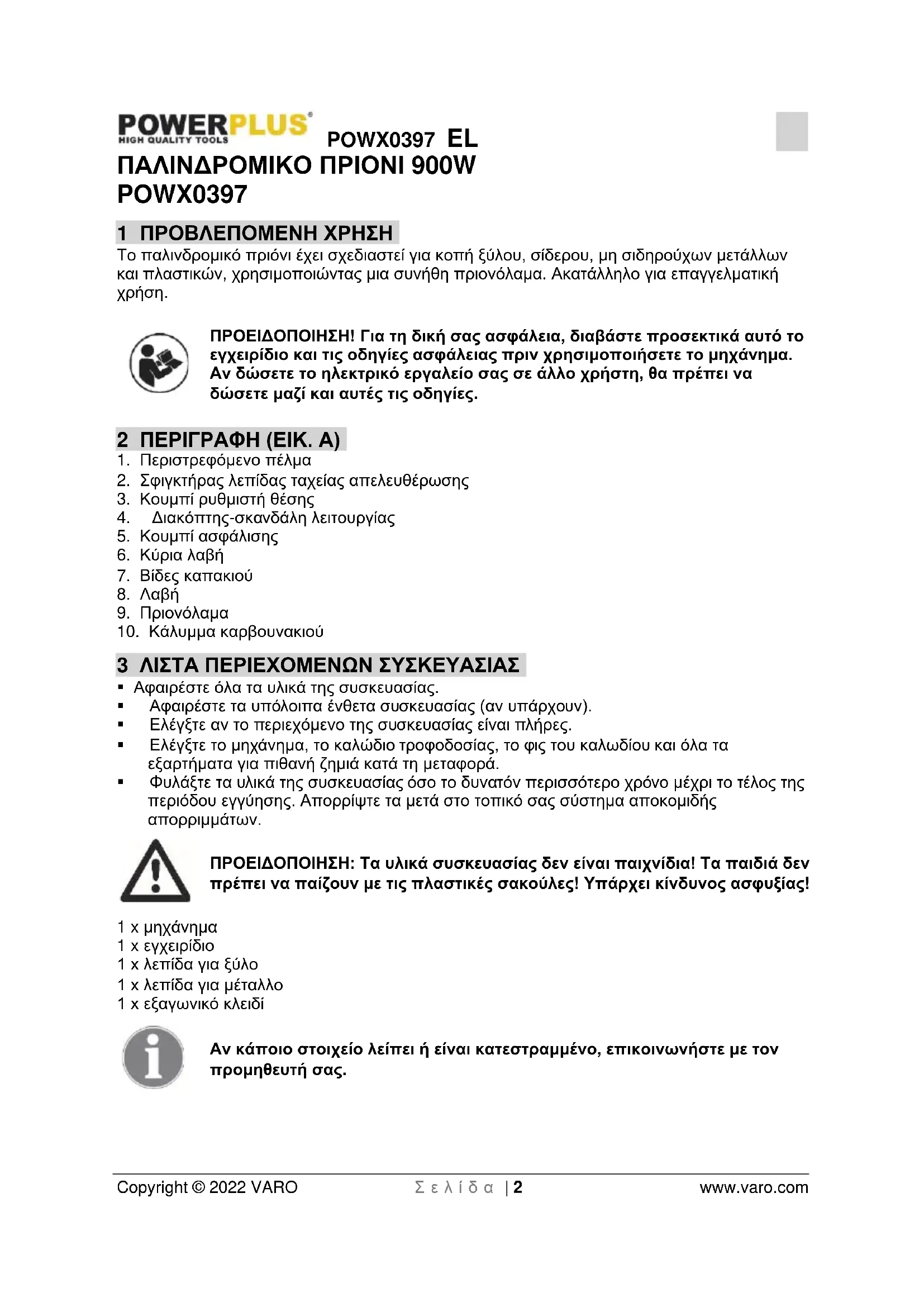 - Φυλάξτε τα υλικά της συσκευασίας όσο το δυνατόν περισσότερο χρόνο μέχρι το τέλος της περιόδου εγγύησης. Απορρίψτε τα μετά στο τοπικό σας σύστημα αποκομιδής απορριμμάτων. ΠΡΟΕΙΔΟΠΟΙΗΣΗ: Τα υλικά συσκευασίας δεν είναι παιχνίδια! Τα παιδιά δεν πρέπει να παίζουν με τις πλαστικές σακούλες! Υπάρχει κίνδυνος ασφυξίας! 1 x μηχάνημα 1 x εγχειρίδιο 1 x λεπίδα για ξύλο 1 x λεπίδα για μέταλλο 1 x εξαγωνικό κλειδί Αν κάποιο στοιχείο λείπει ή είναι κατεστραμμένο, επικοινωνήστε με τον προμηθευτή σας.POWX0397 EL Copyright © 2022 VARO Σ ε λ ί δ α | 3 www.varo.com 4 ΣΥΜΒΟΛΑ Σε αυτό το εγχειρίδιο ή/και πάνω στο εργαλείο χρησιμοποιούνται τα εξής σύμβολα:
