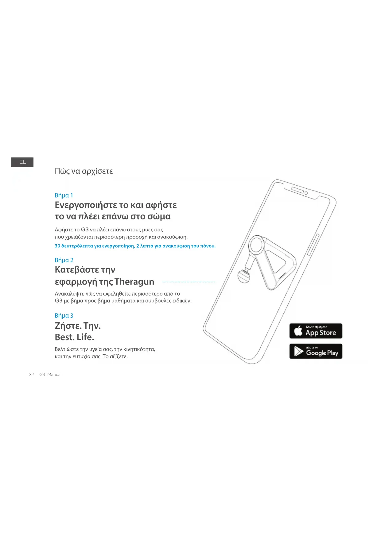 stan akumulatora świeci się światłem ciągłym.PL PL 30 G3 Manual G3 Manual 31 Końcówki Twoje urządzenie G3 jest wyposażone w4unikalne końcówki — stworzone do stosowania na różnych grupach mięśni, przy różnego rodzaju bólach idolegliwościach. Dowiedz się, jak ich używać, z aplikacji Theragun. StożekKońcówka tłumiącaKula standardowaKciuk Pobierz z Pobierz zEL EL 32 G3 Manual G3 Manual 33 Βήμα 1 Αφήστε το G3 να πλέει επάνω στους μύες σας που χρειάζονται περισσότερη προσοχή και ανακούφιση. Ενεργοποιήστε το και αφήστε το να πλέει επάνω στο σώμα Βήμα 2 Βήμα 3 Κατεβάστε την εφαρμογή της Theragun Ζήστε. Την. Best. Life. Ανακαλύψτε πώς να ωφεληθείτε περισσότερο από το G3 με βήμα προς βήμα μαθήματα και συμβουλές ειδικών. Βελτιώστε την υγεία σας, την κινητικότητα, και την ευτυχία σας. Το αξίζετε. Πώς να αρχίσετε 30 δευτερόλεπτα για ενεργοποίηση, 2 λεπτά για ανακούφιση του πόνου. Κάντε λήψη στοπάρτε τοEL EL 32 G3 Manual G3 Manual 33 Θύρα Φόρτισης Εναλλάξιμα εξαρτήματα Κουμπί ενεργοποίησης Λαβή πολλαπλού πιασίματος Φωτεινή ένδειξη LED για την μπαταρία Το G3 Διαβάστε το ένθετο με τις Προειδοποιήσεις για σημαντικές οδηγίες ασφαλούς χρήσης