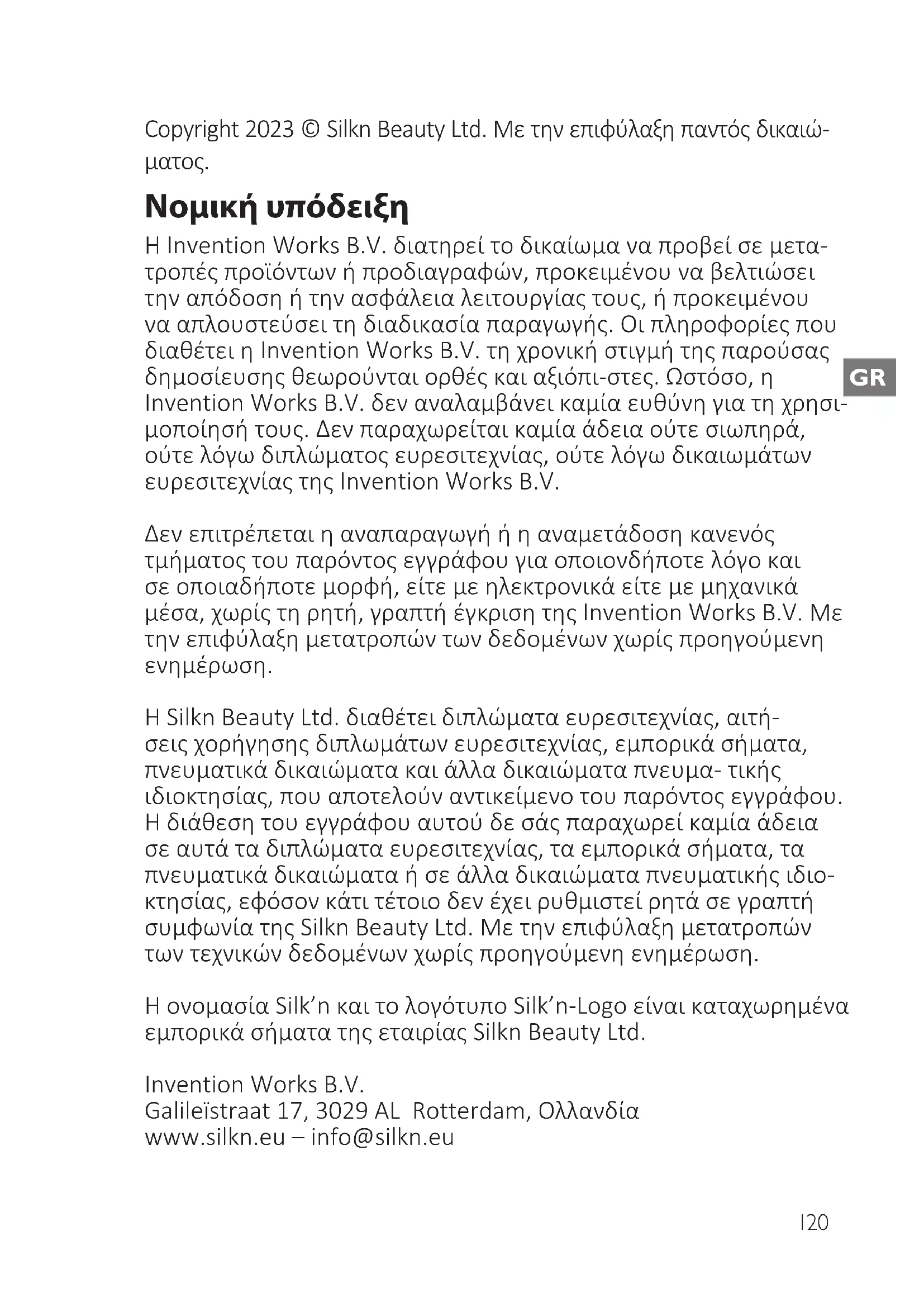 Η Silkn Beauty Ltd. διαθέτει διπλώματα ευρεσιτεχνίας, αιτήσεις χορήγησης διπλωμάτων ευρεσιτεχνίας, εμπορικά σήματα, πνευματικά δικαιώματα και άλλα δικαιώματα πνευμα- τικής ιδιοκτησίας, που αποτελούν αντικείμενο του παρόντος εγγράφου. Η διάθεση του εγγράφου αυτού δε σάς παραχωρεί καμία άδεια σε αυτά τα διπλώματα ευρεσιτεχνίας, τα εμπορικά σήματα, τα πνευματικά δικαιώματα ή σε άλλα δικαιώματα πνευματικής ιδιοκτησίας, εφόσον κάτι τέτοιο δεν έχει ρυθμιστεί ρητά σε γραπτή συμφωνία της Silkn Beauty Ltd. Με την επιφύλαξη μετατροπών των τεχνικών δεδομένων χωρίς προηγούμενη ενημέρωση.