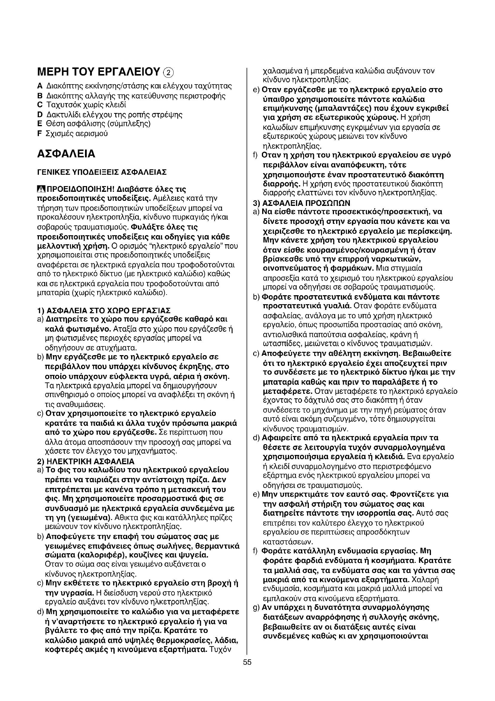 ΜΕΡΗΤΟYΕΡΓΑΛΕΙΟY 2 A Διακόπτης εκκίνησης/στάσης και ελέγχου ταχύτητας B Διακόπτης αλλαγής της κατεύθυνσης περιστροφής C Ταχυτσόκ χωρίς κλειδί D Δακτυλίδι ελέγχου της ροπής στρέψης E Θέση ασφάλισης (σύμπλεξης) F Σχισμές αερισμού