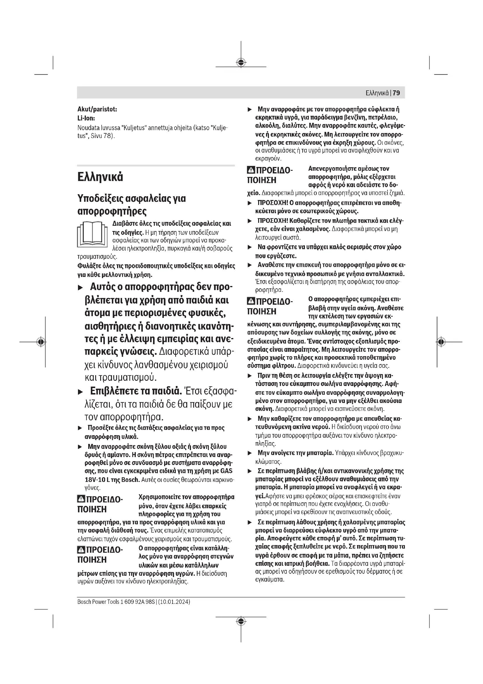 Υποδείξεις ασφαλείας για απορροφητήρες Διαβάστε όλες τις υποδείξεις ασφαλείας και τις οδηγίες. Η μη τήρηση των υποδείξεων ασφαλείας και των οδηγιών μπορεί να προκα- λέσει ηλεκτροπληξία, πυρκαγιά και/ή σοβαρούς τραυματισμούς. Φυλάξτε όλες τις προειδοποιητικές υποδείξεις και οδηγίες για κάθε μελλοντική χρήση. u Αυτός ο απορροφητήρας δεν προ- βλέπεται για χρήση από παιδιά και άτομα με περιορισμένες φυσικές, αισθητήριες ή διανοητικές ικανότη- τες ή με έλλειψη εμπειρίας και ανε- παρκείς γνώσεις. Διαφορετικά υπάρ- χει κίνδυνος λανθασμένου χειρισμού και τραυματισμού. u Επιβλέπετε τα παιδιά. Έτσι εξασφα- λίζεται, ότι τα παιδιά δε θα παίξουν με τον απορροφητήρα. u Προσέξτε όλες τις διατάξεις ασφαλείας για τα προς αναρρόφηση υλικά. u Μην αναρροφάτε σκόνη ξύλου οξιάς ή σκόνη ξύλου δρυός ή αμίαντο. Η σκόνη πέτρας επιτρέπεται να αναρ- ροφηθεί μόνο σε συνδυασμό με συστήματα αναρρόφη- σης, που είναι εγκεκριμένα ειδικά για τη χρήση μεGAS 18V-10 L της Bosch. Αυτές οι ουσίες θεωρούνται καρκινο-