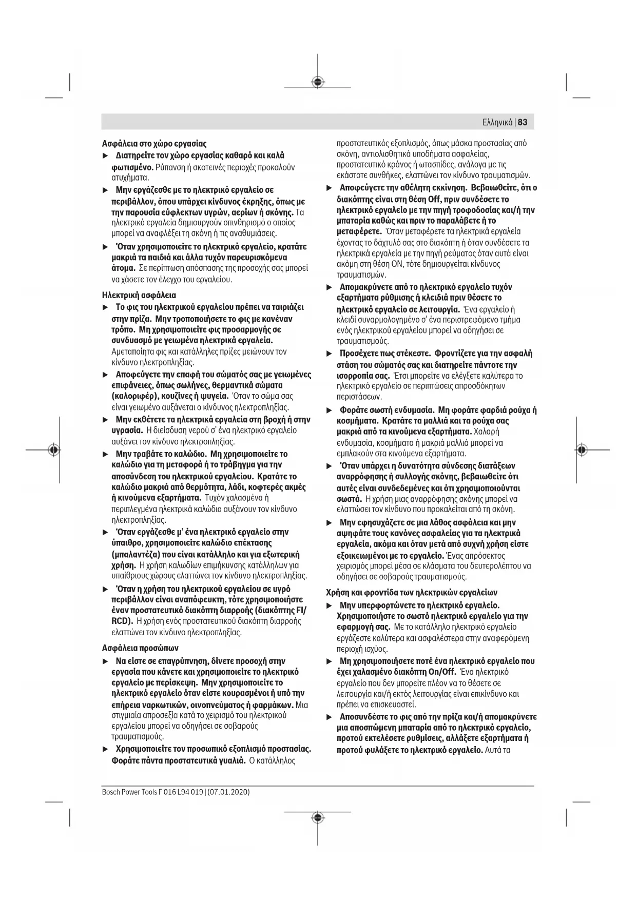 Διαβάστε όλες τις υποδείξεις ασφαλείας, οδηγίες, εικονογραφήσεις και όλα τα τεχνικά στοιχεία, που συνοδεύουν αυτό το ηλεκτρικό εργαλείο. Αμέλειες κατά την τήρηση των ακόλουθων υποδείξεων μπορεί να προκαλέσουν ηλεκτροπληξία, πυρκαγιά και/ή σοβαρούς τραυματισμούς. Φυλάξτε όλες τις προειδοποιητικές υποδείξεις και οδηγίες για κάθε μελλοντική χρήση. Ο όρος «ηλεκτρικό εργαλείο» που χρησιμοποιείται στις προειδοποιητικές υποδείξεις αναφέρεται σε ηλεκτρικά εργαλεία που τροφοδοτούνται από το ηλεκτρικό δίκτυο (με ηλεκτρικό καλώδιο) καθώς και σε ηλεκτρικά εργαλεία που τροφοδοτούνται από μπαταρία (χωρίς ηλεκτρικό καλώδιο). F 016 L94 019 | (07.01.2020) Bosch Power ToolsΕλληνικά | 83 Ασφάλεια στο χώρο εργασίας u Διατηρείτε τον χώρο εργασίας καθαρό και καλά φωτισμένο. Ρύπανση ή σκοτεινές περιοχές προκαλούν