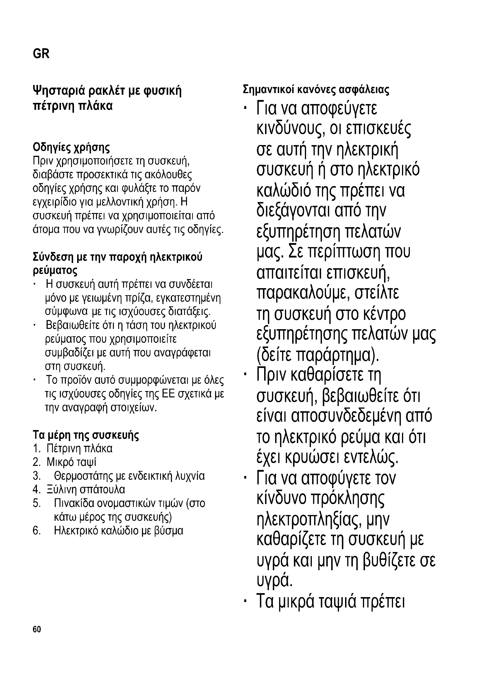 ∙ Τα μικρά ταψιά πρέπει GR61 να καθαρίζονται σε ζεστό σαπουνόνερο. Η πέτρινη πλάκα και οι ξύλινες σπάτουλες πρέπει να καθαρίζονται μόνο κάτω από τρεχούμενο νερό. Για αναλυτικές πληροφορίες για τον καθαρισμό της συσκευής, ανατρέξτε στην παράγραφο «Καθαρισμός και φροντίδα». ∙ Η συσκευή δεν προορίζεται για λειτουργία με εξωτερικό χρονοδιακόπτη ή ξεχωριστό τηλεχειριζόμενο