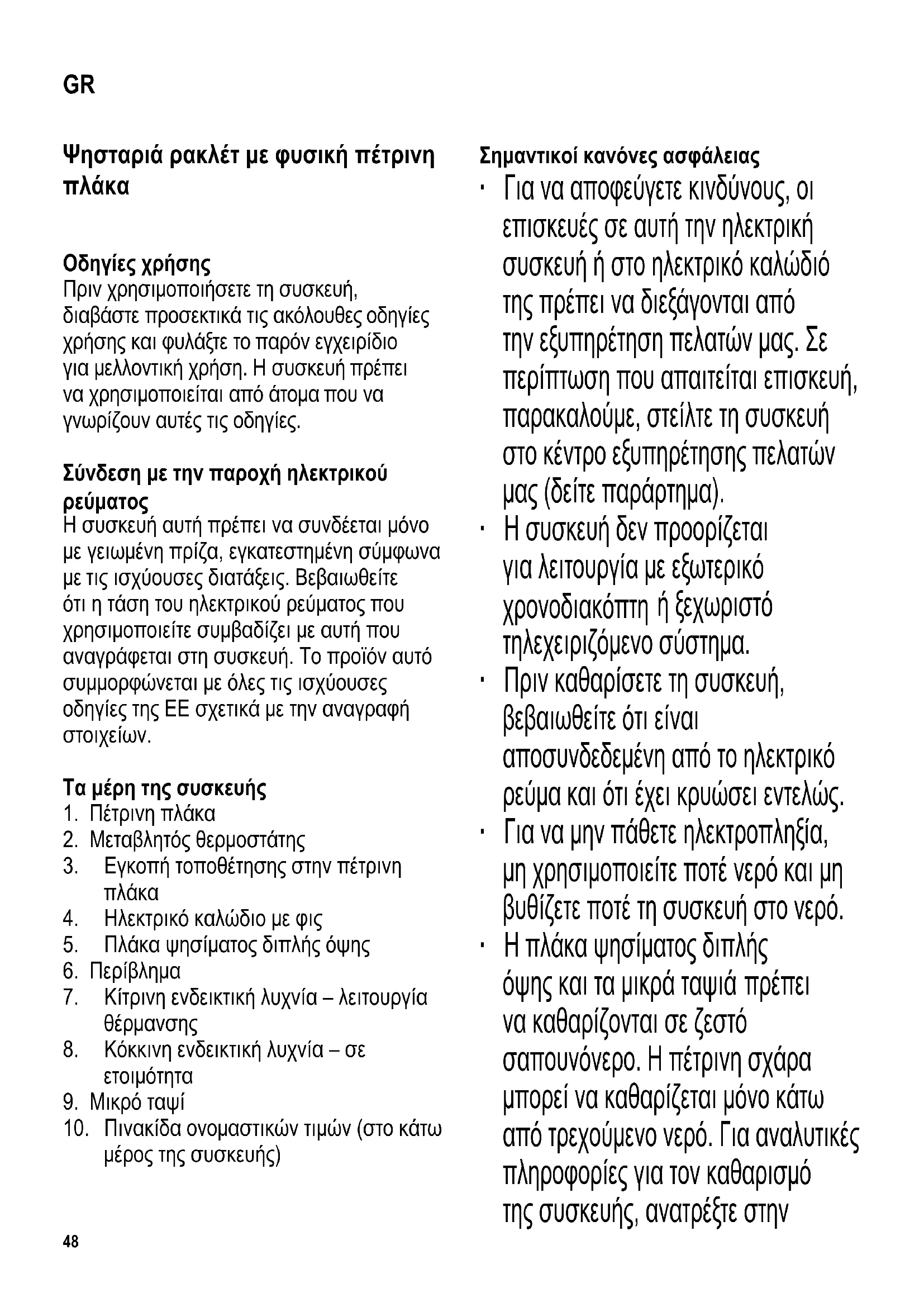 να καθαρίζονται σε ζεστό σαπουνόνερο. Η πέτρινη σχάρα μπορεί να καθαρίζεται μόνο κάτω από τρεχούμενο νερό. Για αναλυτικές πληροφορίες για τον καθαρισμό της συσκευής, ανατρέξτε στην GR49 παράγραφο «Γενικός καθαρισμός και φροντίδα». ∙ Η συσκευή αυτή μπορεί να χρησιμοποιηθεί από παιδιά (τουλάχιστον 8 ετών) και από άτομα με μειωμένες φυσικές, αισθητήριες ή διανοητικές ικανότητες ή χωρίς πείρα και γνώσεις, με την προϋπόθεση ότι επιτηρούνται ή τους έχουν δοθεί οδηγίες σχετικά με τη χρήση της συσκευής και κατανοούν