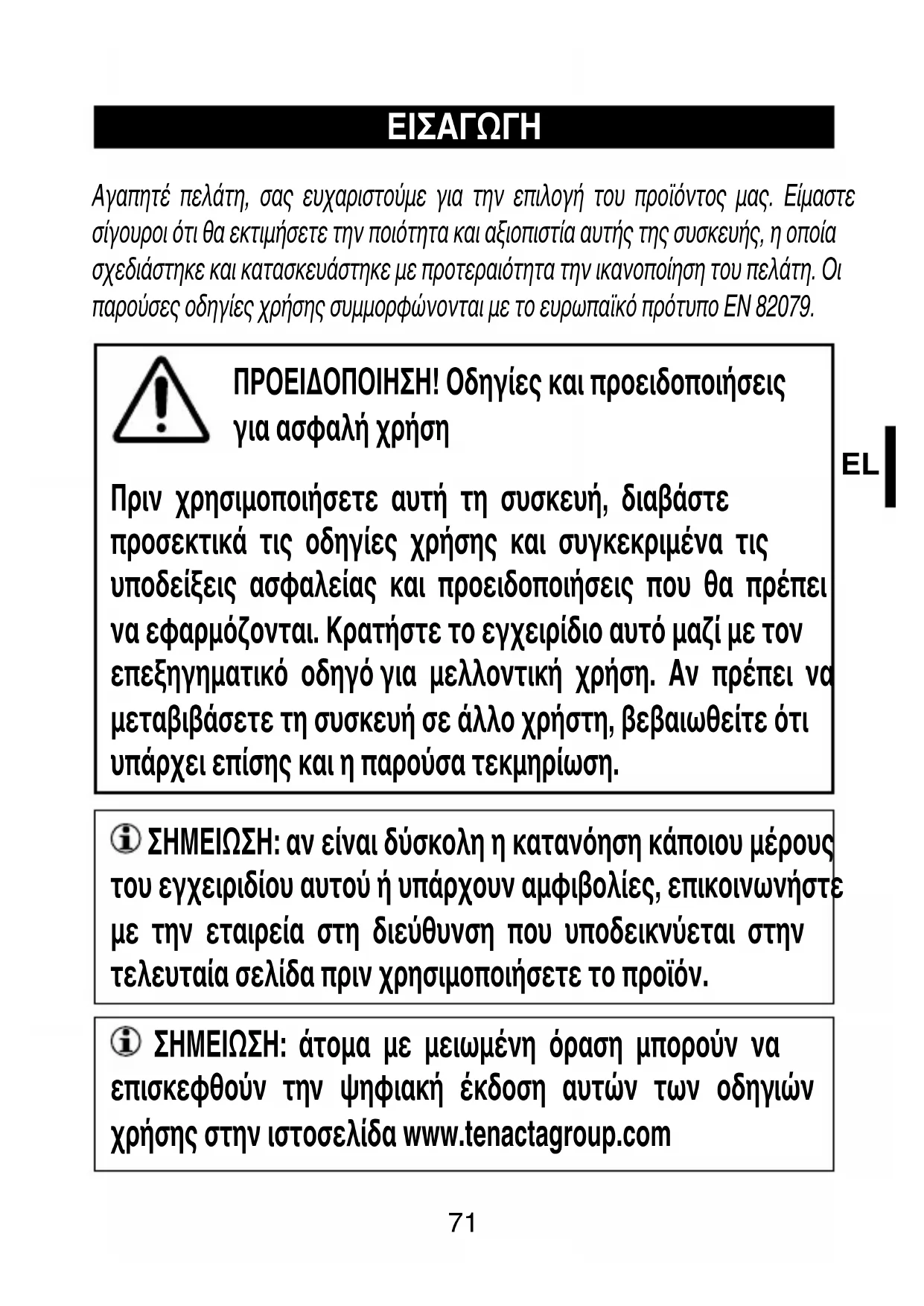 Αγαπητέ πελάτη, σας ευχαριστούμε για την επιλογή του προϊόντος μας. Είμαστε σίγουροι ότι θα εκτιμήσετε την ποιότητα και αξιοπιστία αυτής της συσκευής, η οποία σχεδιάστηκε και κατασκευάστηκε με προτεραιότητα την ικανοποίηση του πελάτη. Οι παρούσες οδηγίες χρήσης συμμορφώνονται με το ευρωπαϊκό πρότυπο EN 82079. ΠΡΟΕΙΔΟΠΟΙΗΣΗ! Οδηγίες και προειδοποιήσεις για ασφαλή χρήση Πριν χρησιμοποιήσετε αυτή τη συσκευή, διαβάστε προσεκτικά τις οδηγίες χρήσης και συγκεκριμένα τις υποδείξεις ασφαλείας και προειδοποιήσεις που θα πρέπει να εφαρμόζονται. Κρατήστε το εγχειρίδιο αυτό μαζί με τον επεξηγηματικό οδηγό για μελλοντική χρήση. Αν πρέπει να μεταβιβάσετε τη συσκευή σε άλλο χρήστη, βεβαιωθείτε ότι υπάρχει επίσης και η παρούσα τεκμηρίωση. ΣΗΜΕΙΩΣΗ: αν είναι δύσκολη η κατανόηση κάποιου μέρους του εγχειριδίου αυτού ή υπάρχουν αμφιβολίες, επικοινωνήστε με την εταιρεία στη διεύθυνση που υποδεικνύεται στην τελευταία σελίδα πριν χρησιμοποιήσετε το προϊόν. ΣΗΜΕΙΩΣΗ: άτομα με μειωμένη όραση μπορούν να επισκεφθούν την ψηφιακή έκδοση αυτών των οδηγιών χρήσης στην ιστοσελίδα www.tenactagroup.com72