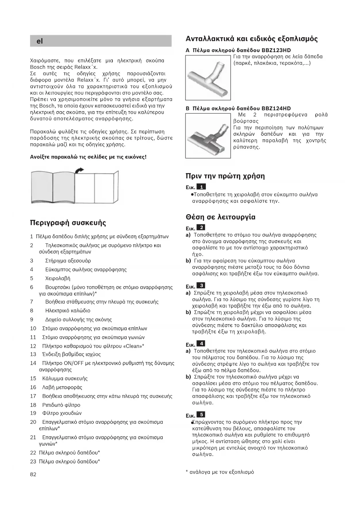 Atenção: não utilize detergentes abrasivos, limpa- vidros ou produtos lava-tudo. Jamais introduza o aspirador na água. O fabricante reserva-se o direito de proceder a quais- quer alterações técnicas.82 Χαιρόμαστε, που επιλέξατε μια ηλεκτρική σκούπα Bosch της σειράς Relaxx´x. Σε αυτές τις οδηγίες χρήσης παρουσιάζονται διάφορα μοντέλα Relaxx´x. Γι’ αυτό μπορεί, να μην αντιστοιχούν όλα τα χαρακτηριστικά του εξοπλισμού και οι λειτουργίες που περιγράφονται στο μοντέλο σας. Πρέπει να χρησιμοποιείτε μόνο τα γνήσια εξαρτήματα της Bosch, τα οποία έχουν κατασκευαστεί ειδικά για την ηλεκτρική σας σκούπα, για την επίτευξη του καλύτερου δυνατού αποτελέσματος αναρρόφησης. Παρακαλώ φυλάξτε τις οδηγίες χρήσης. Σε περίπτωση παράδοσης της ηλεκτρικής σκούπας σε τρίτους, δώστε παρακαλώ μαζί και τις οδηγίες χρήσης. Ανοίξτε παρακαλώ τις σελίδες με τις εικόνες! Περιγραφή συσκευής 1 Πέλμα δαπέδου διπλής χρήσης με σύνδεση εξαρτημάτων 2 Τηλεσκοπικός σωλήνας με συρόμενο πλήκτρο και σύνδεση εξαρτημάτων 3 Στήριγμα αξεσουάρ 4 Εύκαμπτος σωλήνας αναρρόφησης 5 Χειρολαβή 6 Βουρτσάκι (μόνο τοποθέτηση σε στόμιο αναρρόφησης για σκούπισμα επίπλων)* 7 Βοήθεια στάθμευσης στην πλευρά της συσκευής 8 Ηλεκτρικό καλώδιο 9 Δοχείο συλλογής της σκόνης 10 Στόμιο αναρρόφησης για σκούπισμα επίπλων 11 Στόμιο αναρρόφησης για σκούπισμα γωνιών 12 Πλήκτρο καθαρισμού του φίλτρου «Clean»* 13 Ένδειξη βαθμίδας ισχύος 14 Πλήκτρο ON/OFF με ηλεκτρονικό ρυθμιστή της δύναμης αναρρόφησης 15 Κάλυμμα συσκευής 16 Λαβή μεταφοράς 17 Βοήθεια αποθήκευσης στην κάτω πλευρά της συσκευής 18 Ριπιδωτό φίλτρο 19 Φίλτρο χνουδιών 20 Επαγγελματικό στόμιο αναρρόφησης για σκούπισμα