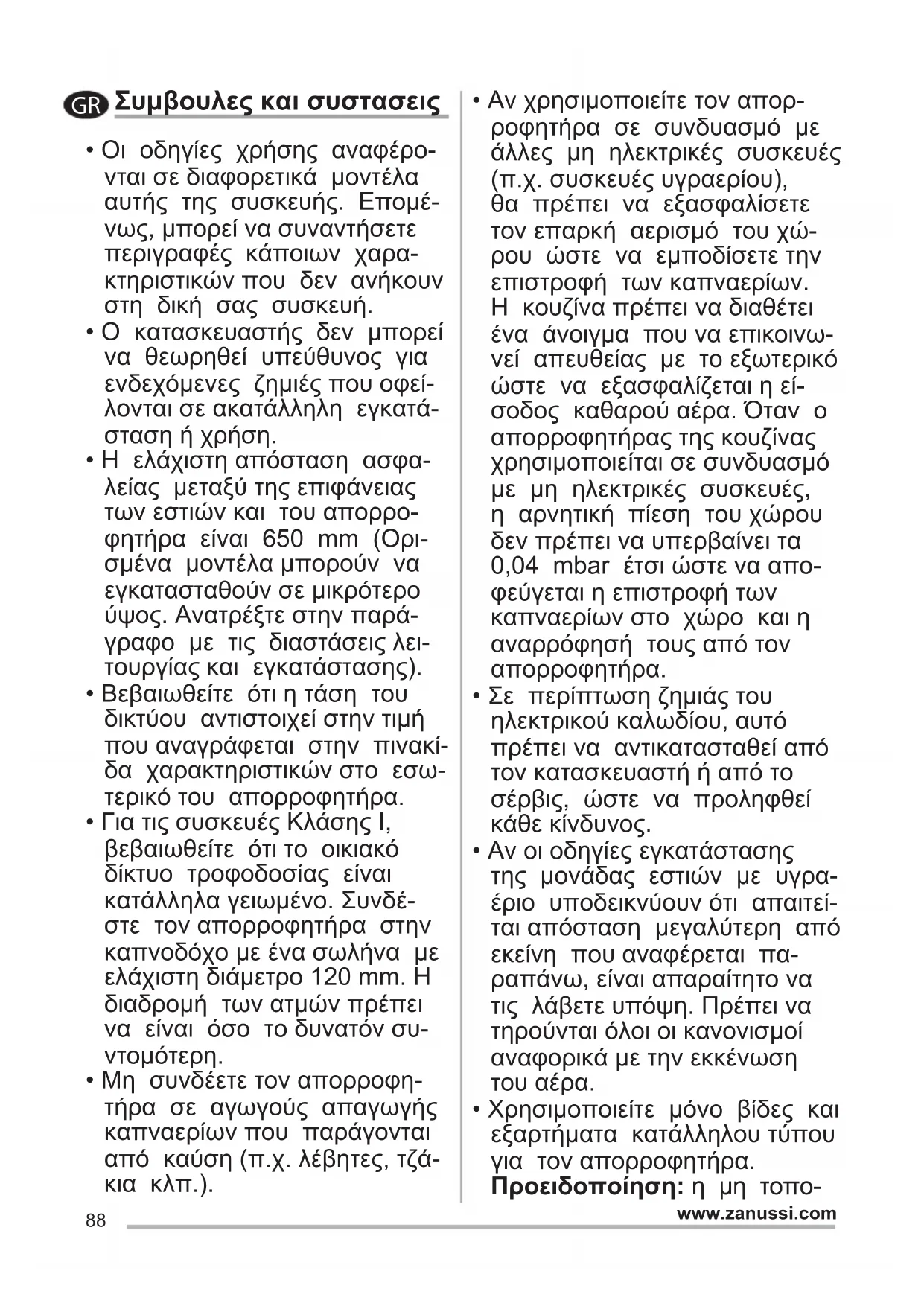 - Χρησιμοποιείτε μόνο βίδες και εξαρτήματα κατάλληλου τύπου για τον απορροφητήρα. Προειδοποίηση: η μη τοπο- GR89 www.zanussi.com θέτηση των βιδών και των συστημάτων στερέωσης σύμ- φωνα με τις παρούσες οδη- γίες, μπορεί να προκαλέσει ηλεκτροπληξία.