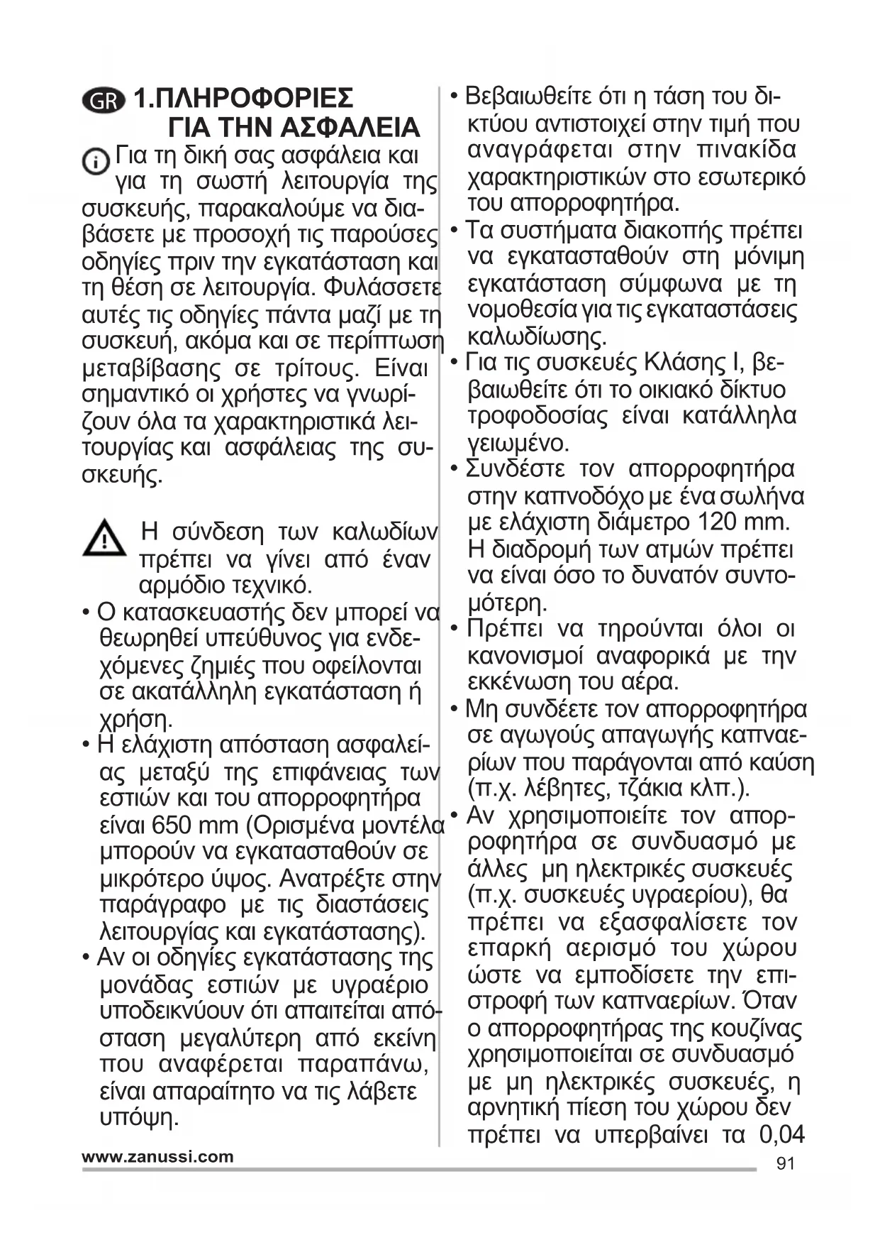 - Αν χρησιμοποιείτε τον απορ- ροφητήρα σε συνδυασμό με άλλες μη ηλεκτρικές συσκευές (π.χ. συσκευές υγραερίου), θα πρέπει να εξασφαλίσετε τον επαρκή αερισμό του χώρου ώστε να εμποδίσετε την επι- στροφή των καπναερίων. Όταν ο απορροφητήρας της κουζίνας χρησιμοποιείται σε συνδυασμό με μη ηλεκτρικές συσκευές, η αρνητική πίεση του χώρου δεν πρέπει να υπερβαίνει τα 0,0492 www.zanussi.com mbar έτσι ώστε να αποφεύγεται η επιστροφή των καπναερίων στο χώρο και η αναρρόφησή τους από τον απορροφητήρα.
