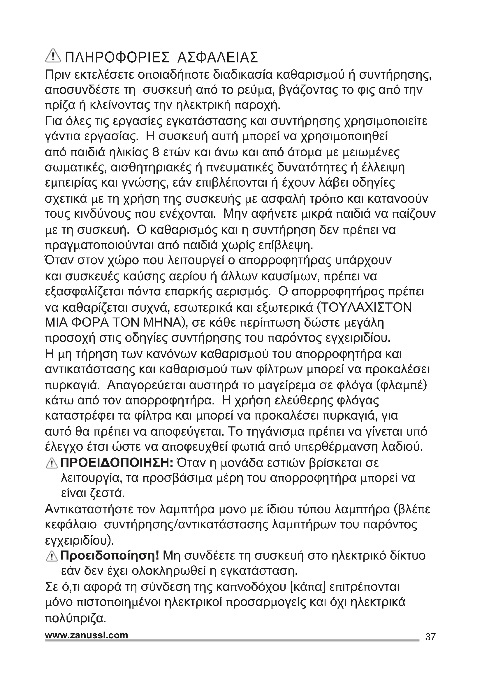 1 ON/OFF luzes 2 OFF motores 3 Potência mínima de aspiração 4 Potência média de aspiração 5 Potência máxima de aspiração Usar a potência de aspiração no caso de uma maior concentração de vapor de cozimento. Aconselhamos ligar a aspiração 5 minutos antes de iniciar a cozinhar e de deixá-la em funcionamento por aproximadamente 15 minutos após o término do cozimento. ILUMINAÇÃO Desligar o aparelho da rede elétrica; Atenção! Antes de tocar as lâmpadas, certificar-se que estejam frias. Substituir a lâmpada danificada. Usar somente lâmpadas de halogéneo 28W Ø35mm vela E14.37 www.zanussi.com ΠΛΗΡΟΦΟΡΙΕΣ ΑΣΦΑΛΕΙΑΣ Πριν εκτελέσετε οποιαδήποτε διαδικασία καθαρισμού ή συντήρησης, αποσυνδέστε τη συσκευή από το ρεύμα, βγάζοντας το φις από την πρίζα ή κλείνοντας την ηλεκτρική παροχή. Για όλες τις εργασίες εγκατάστασης και συντήρησης χρησιμοποιείτε γάντια εργασίας. Η συσκευή αυτή μπορεί να χρησιμοποιηθεί από παιδιά ηλικίας 8 ετών και άνω και από άτομα με μειωμένες σωματικές, αισθητηριακές ή πνευματικές δυνατότητες ή έλλειψη εμπειρίας και γνώσης, εάν επιβλέπονται ή έχουν λάβει οδηγίες σχετικά με τη χρήση της συσκευής με ασφαλή τρόπο και κατανοούν τους κινδύνους που ενέχονται. Μην αφήνετε μικρά παιδιά να παίζουν με τη συσκευή. Ο καθαρισμός και η συντήρηση δεν πρέπει να πραγματοποιούνται από παιδιά χωρίς επίβλεψη. Όταν στον χώρο που λειτουργεί ο απορροφητήρας υπάρχουν και συσκευές καύσης αερίου ή άλλων καυσίμων, πρέπει να εξασφαλίζεται πάντα επαρκής αερισμός. Ο απορροφητήρας πρέπει να καθαρίζεται συχνά, εσωτερικά και εξωτερικά (ΤΟΥΛΑΧΙΣΤΟΝ ΜΙΑ ΦΟΡΑ ΤΟΝ ΜΗΝΑ), σε κάθε περίπτωση δώστε μεγάλη προσοχή στις οδηγίες συντήρησης του παρόντος εγχειριδίου. Η μη τήρηση των κανόνων καθαρισμού του απορροφητήρα και αντικατάστασης και καθαρισμού των φίλτρων μπορεί να προκαλέσει πυρκαγιά. Απαγορεύεται αυστηρά το μαγείρεμα σε φλόγα (φλαμπέ) κάτω από τον απορροφητήρα. Η χρήση ελεύθερης φλόγας καταστρέφει τα φίλτρα και μπορεί να προκαλέσει πυρκαγιά, για αυτό θα πρέπει να αποφεύγεται. Το τηγάνισμα πρέπει να γίνεται υπό έλεγχο έτσι ώστε να αποφευχθεί φωτιά από υπερθέρμανση λαδιού. ΠΡΟΕΙΔΟΠΟΙΗΣΗ: Όταν η μονάδα εστιών βρίσκεται σε λειτουργία, τα προσβάσιμα μέρη του απορροφητήρα μπορεί να είναι ζεστά. Αντικαταστήστε τον λαμπτήρα μονο με ίδιου τύπου λαμπτήρα (βλέπε κεφάλαιο συντήρησης/αντικατάστασης λαμπτήρων του παρόντος εγχειριδίου). Προειδοποίηση! Μη συνδέετε τη συσκευή στο ηλεκτρικό δίκτυο εάν δεν έχει ολοκληρωθεί η εγκατάσταση. Σε ό,τι αφορά τη σύνδεση της καπνοδόχου [κάπα] επιτρέπονται μόνο πιστοποιημένοι ηλεκτρικοί προσαρμογείς και όχι ηλεκτρικά πολύπριζα.38 www.zanussi.com ΟΔΗΓΙΕΣ ΑΣΦΑΛΕΙΑΣ Πρέπει να τηρούνται πιστά όλοι οι ισχύοντες τοπικοί κανονισμοί για τα τεχνικά μέτρα και τα μέτρα ασφαλείας της εκκένωσης των καπνών. Ο αέρας που αποβάλλεται δεν πρέπει να κατευθύνεται σε αγωγό που χρησιμοποιείται για την εκκένωση καπνών που παράγονται από συσκευές καύσης αερίου ή άλλου είδους καύση. Μη χρησιμοποιείτε ή μην αφήνετε τον απορροφητήρα χωρίς λάμπες σωστά τοποθετημένες, εξαιτίας ενδεχόμενου κινδύνου ηλεκτροπληξίας. Μη χρησιμοποιείτε ποτέ τον απορροφητήρα αν δεν είναι σωστά τοποθετημένο το μεταλλικό