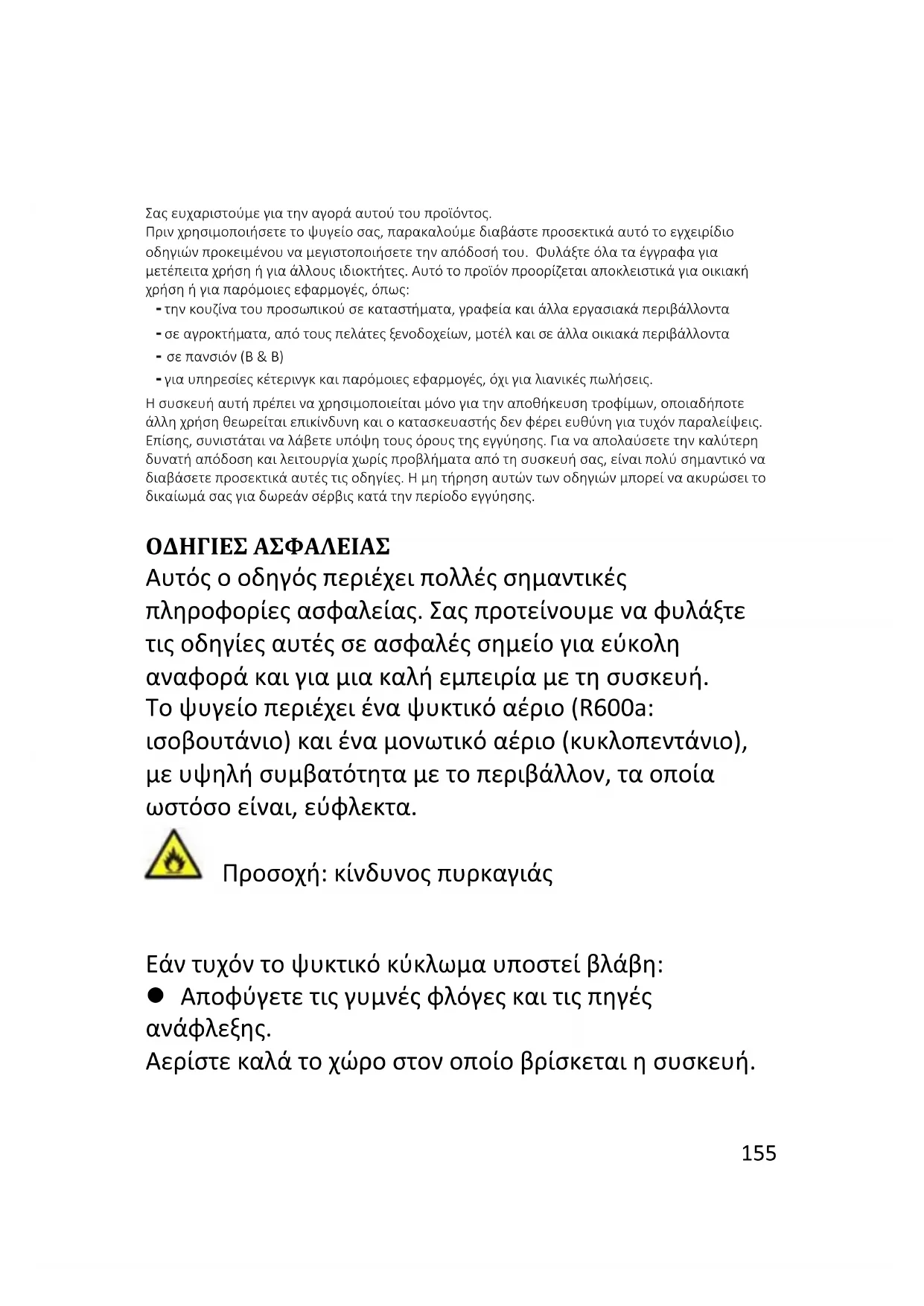 Σας ευχαριστούμε για την αγορά αυτού του προϊόντος. Πριν χρησιμοποιήσετε το ψυγείο σας, παρακαλούμε διαβάστε προσεκτικά αυτό το εγχειρίδιο οδηγιών προκειμένου να μεγιστοποιήσετε την απόδοσή του. Φυλάξτε όλα τα έγγραφα για μετέπειτα χρήση ή για άλλους ιδιοκτήτες. Αυτό το προϊόν προορίζεται αποκλειστικά για οικιακή χρήση ή για παρόμοιες εφαρμογές, όπως: - την κουζίνα του προσωπικού σε καταστήματα, γραφεία και άλλα εργασιακά περιβάλλοντα - σε αγροκτήματα, από τους πελάτες ξενοδοχείων, μοτέλ και σε άλλα οικιακά περιβάλλοντα - σε πανσιόν (B & B) - για υπηρεσίες κέτερινγκ και παρόμοιες εφαρμογές, όχι για λιανικές πωλήσεις. Η συσκευή αυτή πρέπει να χρησιμοποιείται μόνο για την αποθήκευση τροφίμων, οποιαδήποτε άλλη χρήση θεωρείται επικίνδυνη και ο κατασκευαστής δεν φέρει ευθύνη για τυχόν παραλείψεις. Επίσης, συνιστάται να λάβετε υπόψη τους όρους της εγγύησης. Για να απολαύσετε την καλύτερη δυνατή απόδοση και λειτουργία χωρίς προβλήματα από τη συσκευή σας, είναι πολύ σημαντικό να διαβάσετε προσεκτικά αυτές τις οδηγίες. Η μη τήρηση αυτών των οδηγιών μπορεί να ακυρώσει το δικαίωμά σας για δωρεάν σέρβις κατά την περίοδο εγγύησης. ΟΔΗΓΙΕΣ ΑΣΦΑΛΕΙΑΣ Αυτός ο οδηγός περιέχει πολλές σημαντικές πληροφορίες ασφαλείας. Σας προτείνουμε να φυλάξτε τις οδηγίες αυτές σε ασφαλές σημείο για εύκολη αναφορά και για μια καλή εμπειρία με τη συσκευή. Το ψυγείο περιέχει ένα ψυκτικό αέριο (R600a: ισοβουτάνιο) και ένα μονωτικό αέριο (κυκλοπεντάνιο), με υψηλή συμβατότητα με το περιβάλλον, τα οποία ωστόσο είναι, εύφλεκτα. Προσοχή: κίνδυνος πυρκαγιάς Εάν τυχόν το ψυκτικό κύκλωμα υποστεί βλάβη: Αποφύγετε τις γυμνές φλόγες και τις πηγές