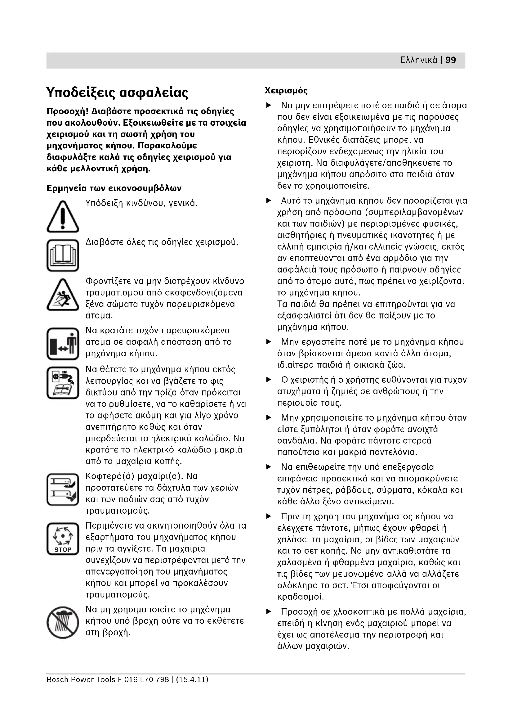 f Προσοχή σε χλοοκοπτικά με πολλά μαχαίρια, επειδή η κίνηση ενός μαχαιριού μπορεί να έχει ως αποτέλεσμα την περιστροφή και άλλων μαχαιριών. STOP OBJ_BUCH-1393-001.book Page 99 Friday, April 15, 2011 10:36 AM100 | Eλληνικά F 016 L70 798 | (15.4.11) Bosch Power Tools f Να εργάζεστε πάντοτε υπό το φως της ημέρας ή υπό καλό τεχνητό φως. f Μην εργαστείτε με το μηχάνημα κήπου όταν το χορτάρι είναι υγρό. f Να προχωράτε πάντοτε με ησυχία, χωρίς να