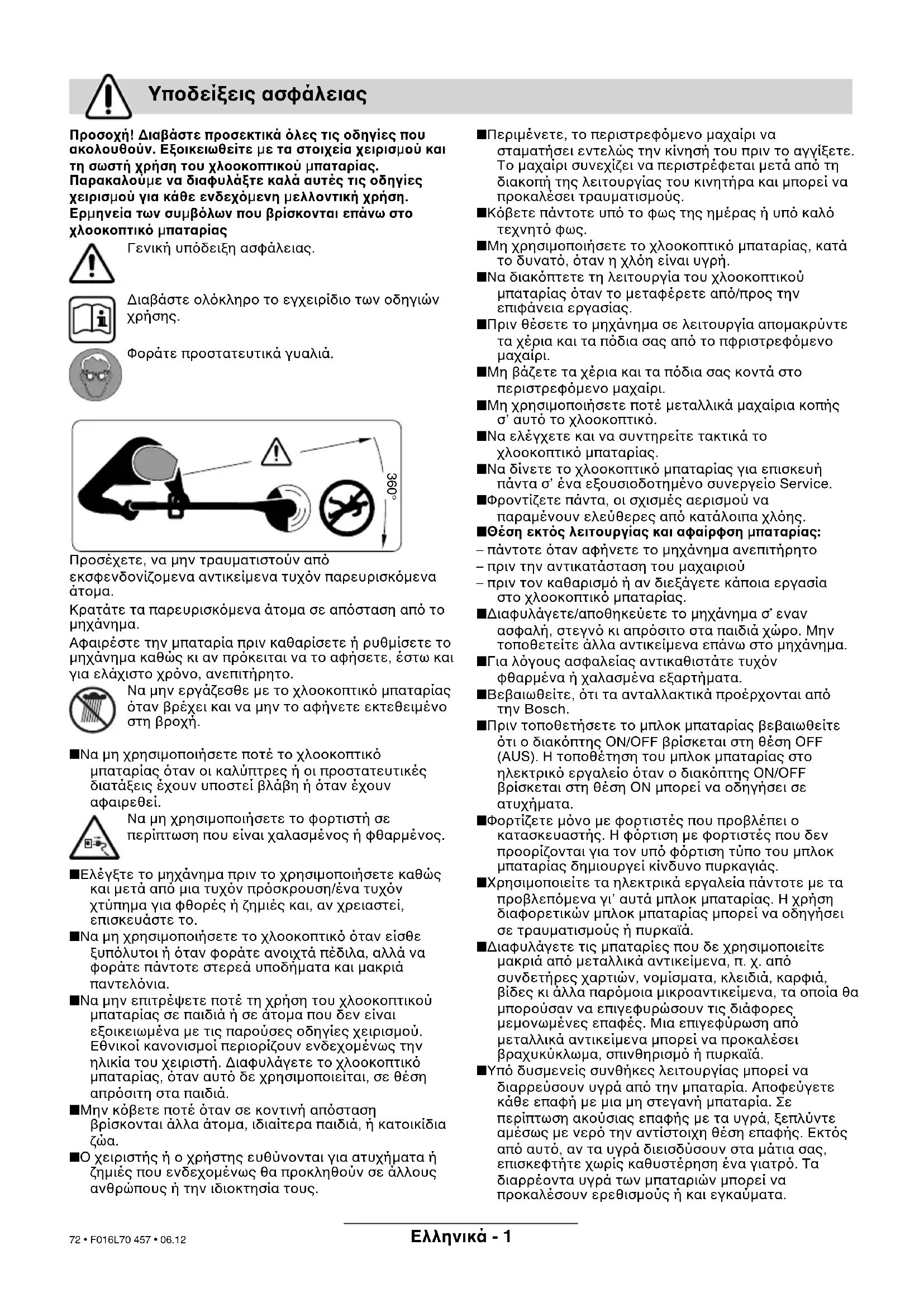 ■ Φορτίζετε µνο µε φορτιστές που προβλέπει ο κατασκευαστής. Η φρτιση µε φορτιστές που δεν προορίζονται για τον υπ φρτιση τύπο του µπλοκ µπαταρίας δηµιουργεί κίνδυνο πυρκαγιάς. ■ Χρησιµοποιείτε τα ηλεκτρικά εργαλεία πάντοτε µε τα προβλεπµενα γι’ αυτά µπλοκ µπαταρίας. Η χρήση διαφορετικών µπλοκ µπαταρίας µπορεί να οδηγήσει σε τραυµατισµούς ή πυρκαϊά. ■ ∆ιαφυλάγετε τις µπαταρίες που δε χρησιµοποιείτε µακριά απ µεταλλικά αντικείµενα, π. χ. απ συνδετήρες χαρτιών, νοµίσµατα, κλειδιά, καρφιά, βίδες κι άλλα παρµοια µικροαντικείµενα, τα οποία θα µπορούσαν να επιγεφυρώσουν τις διάφορες µεµονωµένες επαφές. Μια επιγεφύρωση απ µεταλλικά αντικείµενα µπορεί να προκαλέσει βραχυκύκλωµα, σπινθηρισµ ή πυρκαϊά. ■ Υπ δυσµενείς συνθήκες λειτουργίας µπορεί να διαρρεύσουν υγρά απ την µπαταρία. Αποφεύγετε κάθε επαφή µε µια µη στεγανή µπαταρία. Σε περίπτωση ακούσιας επαφής µε τα υγρά, ξεπλύντε αµέσως µε νερ την αντίστοιχη θέση επαφής. Εκτς απ αυτ, αν τα υγρά διεισδύσουν στα µάτια σας, επισκεφτήτε χωρίς καθυστέρηση ένα γιατρ. Τα διαρρέοντα υγρά των µπαταριών µπορεί να προκαλέσουν ερεθισµούς ή και εγκαύµατα. Υποδείξεις ασφάλειας 360° F016L70 457.book Seite 1 Montag, 18. Dezember 2006 9:45 09 72 • F016L70 457 • 06.12Eλληνικά - 2 Το µηχάνηµα προορίζεται για την κοπή γρασιδιού και ζιζανίων κάτω απ θάµνους καθώς και σε κατηφοριές και άκρες, που δεν µπορούν να χρησιµοποιηθούν τα κοινά χλοοκοπτικά. Η χρήση σύµφωνα µε τον προορισµ βασίζεται σε θερµοκρασία του περιβάλλοντος µεταξύ 0 °C και 40 °C. Το εγχειρίδιο αυτ περιέχει οδηγίες σχετικά µε τη σωστή συναρµολγηση και την ασφαλή χρήση του µηχανήµατς σας. Η ανάγνωση των οδηγιών αυτών είναι σηµαντική. Αφαιρέστε το χλοοκοπτικ µπαταρίας προσεκτικά απ τη συσκευασία κι ελέγξτε, αν υπάρχουν λα τα παρακάτω εξαρτήµατα: