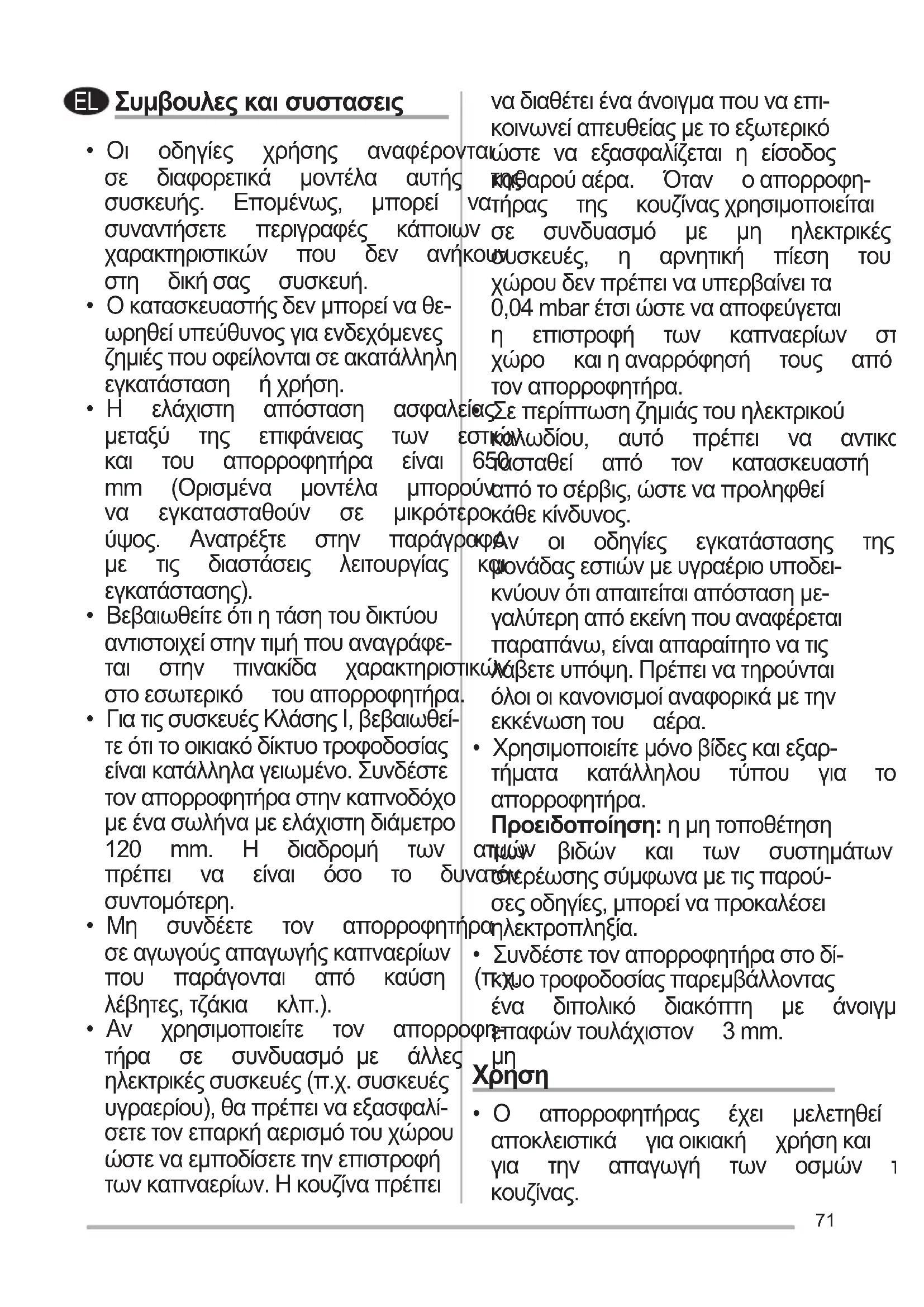 - Μη συνδέετε τον απορροφητήρα σεαγωγούςαπαγωγήςκαπναερίων που παράγονται από καύση (π.χ. λέβητες,τζάκια κλπ.).