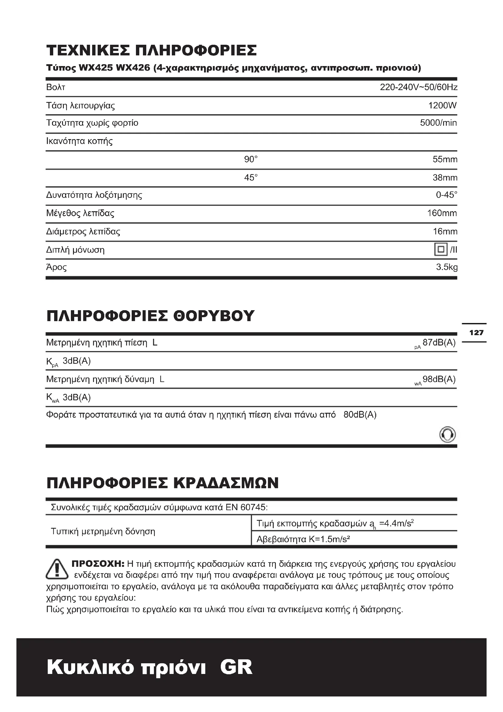 ΤΕΧΝΙΚΕΣ ΠΛΉΡΟΦΟΡΙΕΣ Τύπος WX425 WX426 (4-χαρακτηρισμός μηχανήματος, αντιπροσωπ. πριονιού) ΠΛΉΡΟΦΟΡΙΕΣ ΘΟΡΎΒΟΎ Μετρημένη ηχητική πίεση L