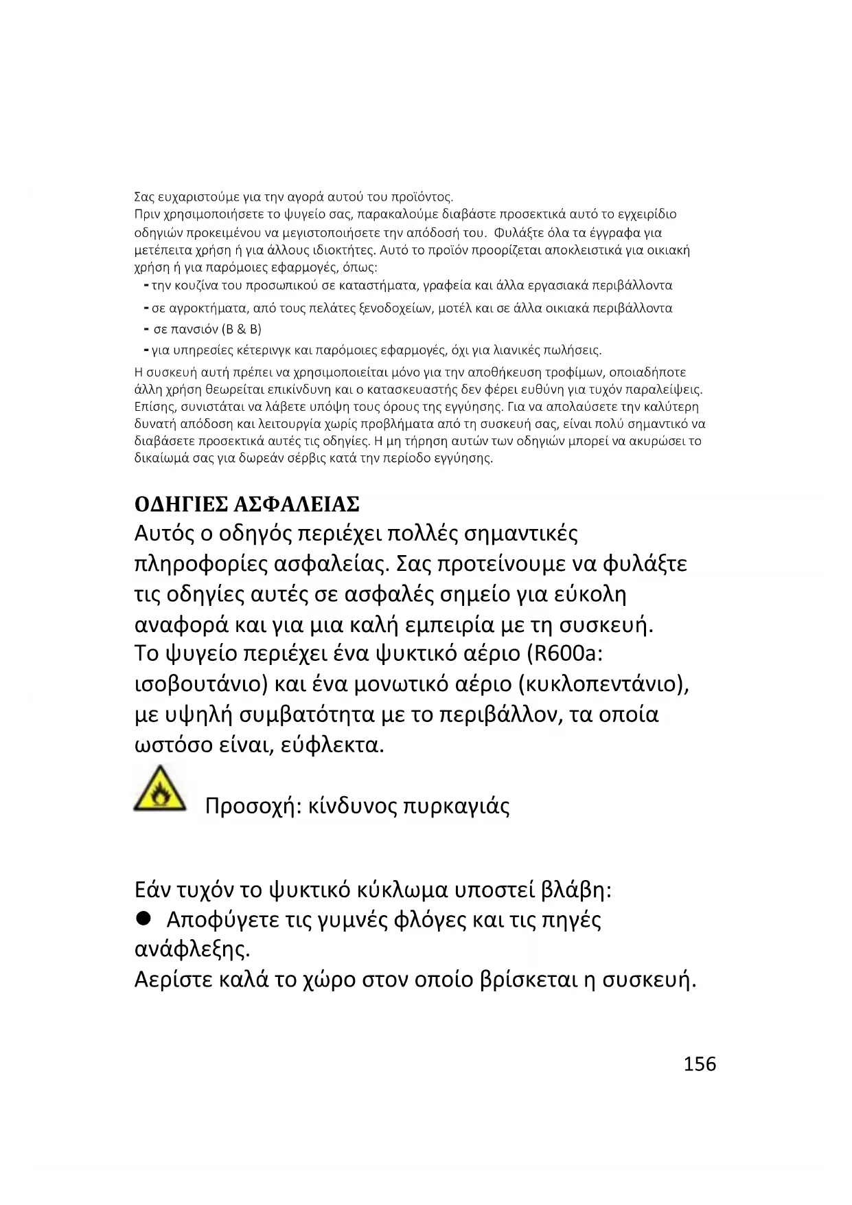 Αυτός ο οδηγός περιέχει πολλές σημαντικές πληροφορίες ασφαλείας. Σας προτείνουμε να φυλάξτε τις οδηγίες αυτές σε ασφαλές σημείο για εύκολη αναφορά και για μια καλή εμπειρία με τη συσκευή. Το ψυγείο περιέχει ένα ψυκτικό αέριο (R600a: ισοβουτάνιο) και ένα μονωτικό αέριο (κυκλοπεντάνιο), με υψηλή συμβατότητα με το περιβάλλον, τα οποία ωστόσο είναι, εύφλεκτα.