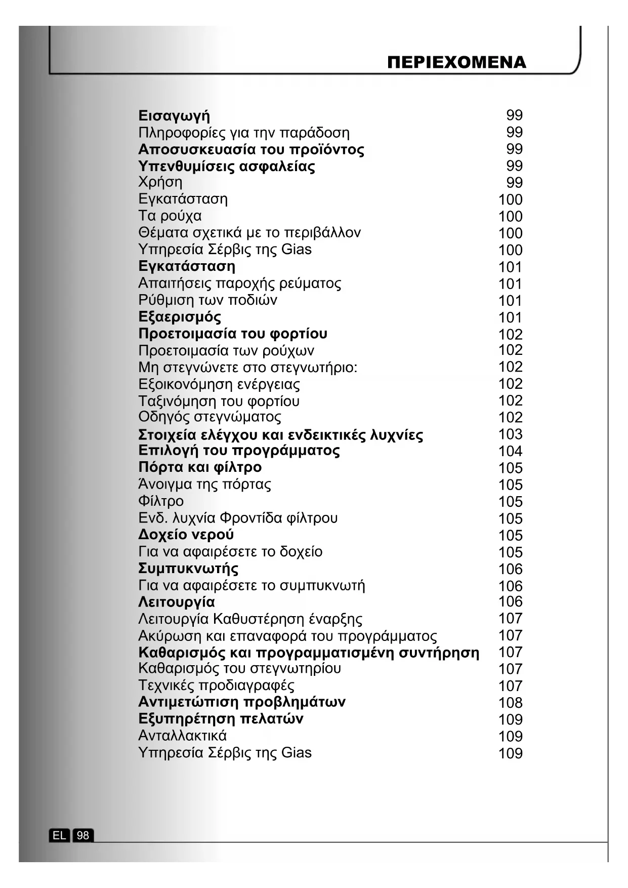 Λειτουργία Καθυστέρηση έναρξης Ακύρωση και επαναφορά του προγράμματος Καθαρισμός και προγραμματισμένη συντήρηση Καθαρισμός του στεγνωτηρίου Τεχνικές προδιαγραφές Αντιμετώπιση προβλημάτων Εξυπηρέτηση πελατών Ανταλλακτικά Υπηρεσία Σέρβις της Gias ΠΕΡΙΕΧΟΜΕΝΑ