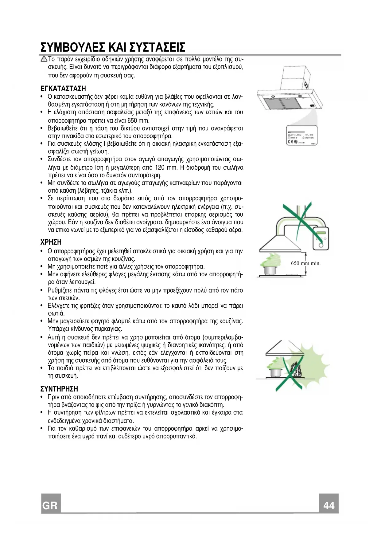 - Για τον καθαρισµό των επιφανειών του απορροφητήρα αρκεί να χρησιµο- ποιήσετε ένα υγρό πανί και ουδέτερο υγρό απορρυπαντικό. 650 mm min.GR