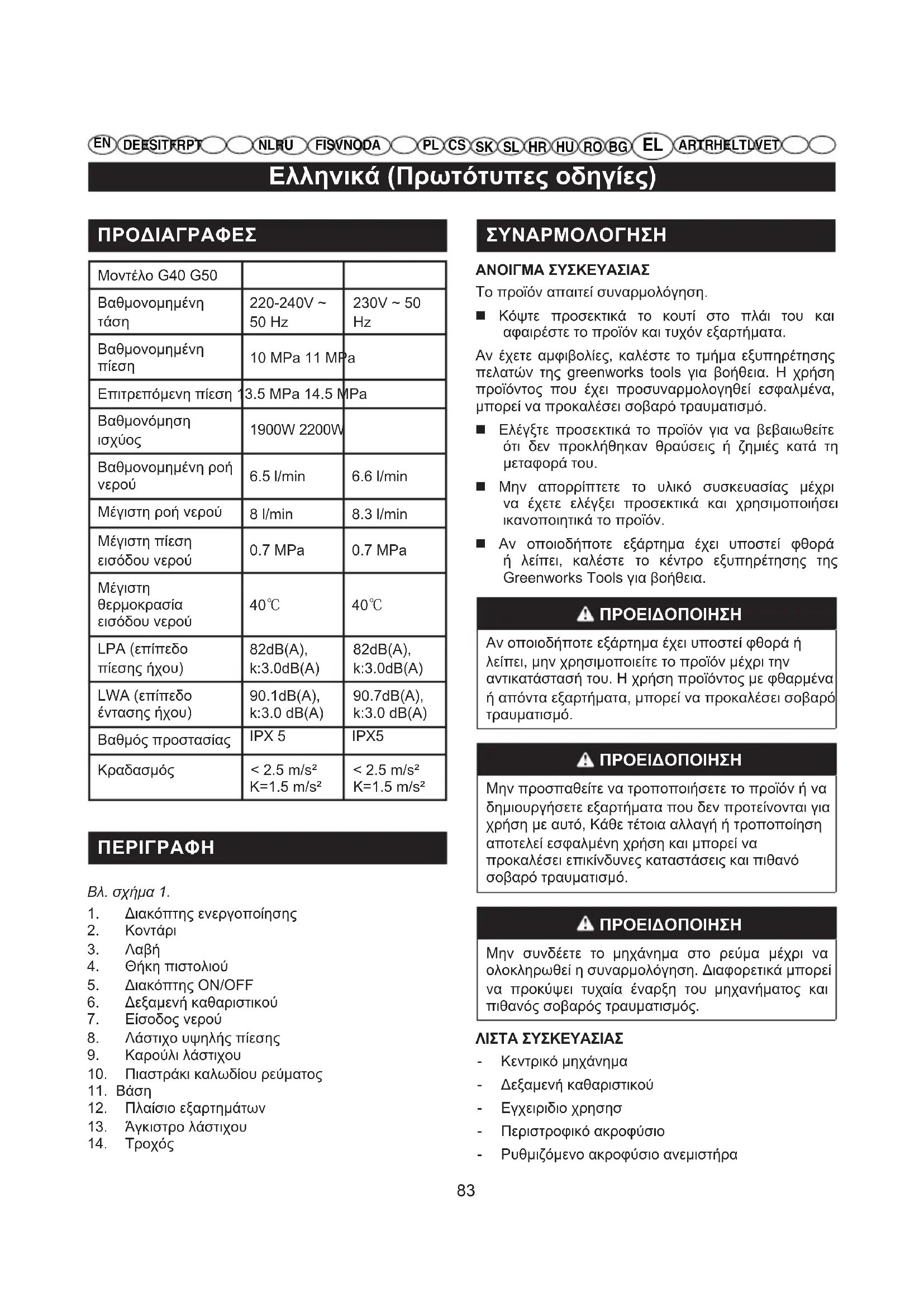 Κατεβάστε τις οδηγίες για το υψηλής πίεσης καθαριστής σε μορφή PDF δωρεάν! Βρείτε το εγχειρίδιό σας G50 - GREENWORKS και πάρτε ξανά την ηλεκτρονική σας συσκευή στα χέρια σας. Σε αυτή τη σελίδα δημοσιεύονται όλα τα έγγραφα που απαιτούνται για τη χρήση της συσκευής σας. G50 της μάρκας GREENWORKS.