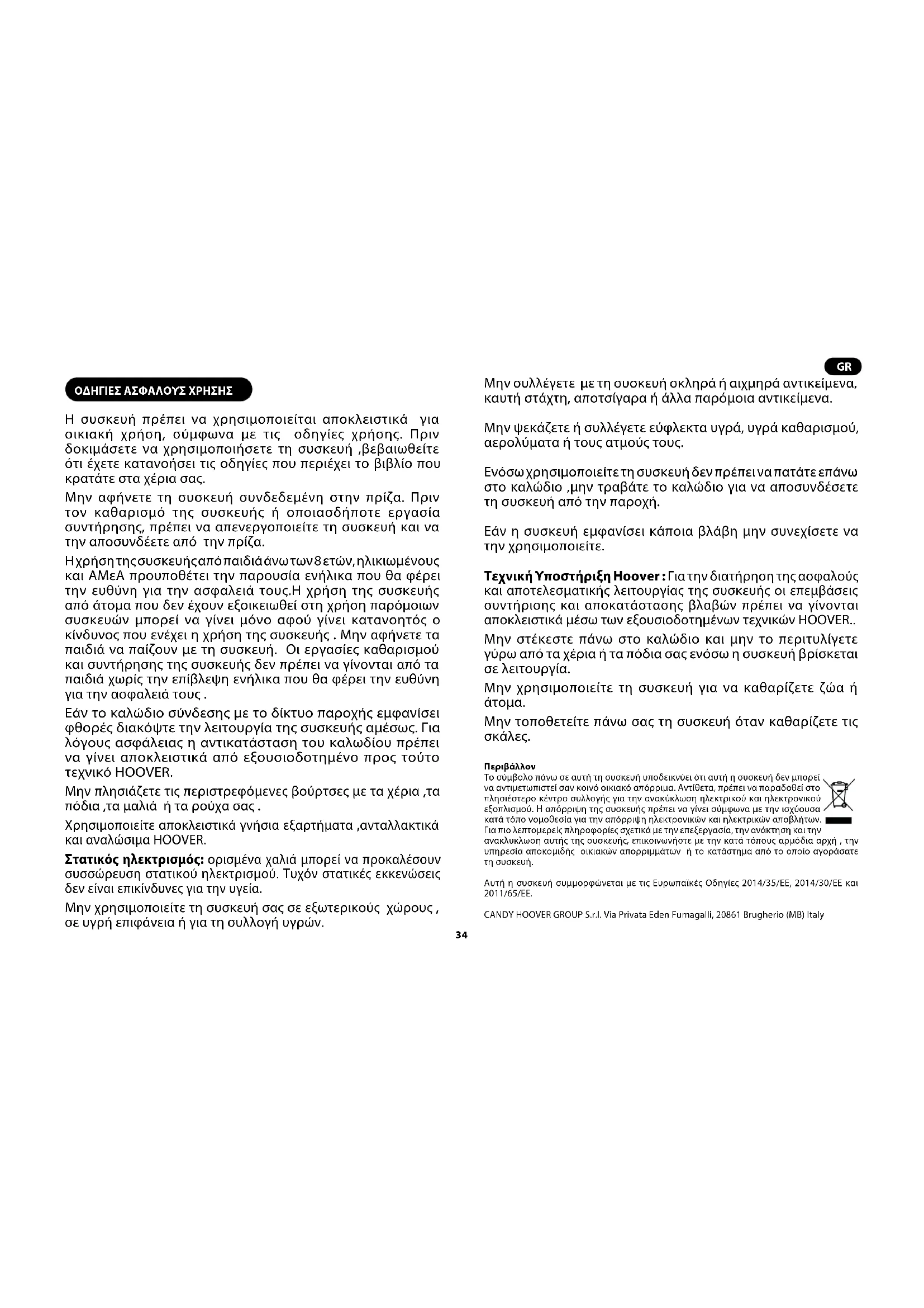 Hoover-varaosat ja tarvikkeet Käytä vain alkuperäisiä Hoover-varaosia. Niitä on saatavana paikalliselta Hoover- jälleenmyyjältä tai valtuutetusta huoltoliikkeestä. Mainitse varaosatilauksen yhteydessä laitteen tyyppinumero. Laatu Hooverin tehtaat on arvioitu laadun suhteen riippumattoman tahon toimesta. Tuotantoprosessimme täyttävät ISO 9001 -laatujärjestelmän vaatimukset. Takuu Tämän laitteen takuuehdot määrittelee ostomaan Hoover-edustaja. Yksityiskohtaiset tiedot näistä ehdoista saa laitteen myyneeltä jälleenmyyjältä. Tämän takuun mukaisia vaateita esitettäessä on esitettävä myyntitodistus tai ostokuitti. Oikeus muutoksiin pidätetään. FIΟΔΗΓΙΕΣ ΑΣΦΑΛΟΥΣ ΧΡΗΣΗΣ H συσκευή πρέπει να χρησιμοποιείται αποκλειστικά για οικιακή χρήση, σύμφωνα με τις οδηγίες χρήσης. Πριν δοκιμάσετε να χρησιμοποιήσετε τη συσκευή ,βεβαιωθείτε ότι έχετε κατανοήσει τις οδηγίες που περιέχει το βιβλίο που κρατάτε στα χέρια σας. Μην αφήνετε τη συσκευή συνδεδεμένη στην πρίζα. Πριν τον καθαρισμό της συσκευής ή οποιασδήποτε εργασία συντήρησης, πρέπει να απενεργοποιείτε τη συσκευή και να την αποσυνδέετε από την πρίζα. Η χρήση της συσκευής από παιδιά άνω των 8 ετών, ηλικιωμένους και ΑΜεΑ προυποθέτει την παρουσία ενήλικα που θα φέρει την ευθύνη για την ασφαλειά τους.Η χρήση της συσκευής από άτομα που δεν έχουν εξοικειωθεί στη χρήση παρόμοιων συσκευών μπορεί να γίνει μόνο αφού γίνει κατανοητός ο κίνδυνος που ενέχει η χρήση της συσκευής . Μην αφήνετε τα παιδιά να παίζουν με τη συσκευή. Οι εργασίες καθαρισμού και συντήρησης της συσκευής δεν πρέπει να γίνονται από τα παιδιά χωρίς την επίβλεψη ενήλικα που θα φέρει την ευθύνη για την ασφαλειά τους . Εάν το καλώδιο σύνδεσης με το δίκτυο παροχής εμφανίσει φθορές διακόψτε την λειτουργία της συσκευής αμέσως. Για λόγους ασφάλειας η αντικατάσταση του καλωδίου πρέπει να γίνει αποκλειστικά από εξουσιοδοτημένο προς τούτο τεχνικό HOOVER. Μην πλησιάζετε τις περιστρεφόμενες βούρτσες με τα χέρια ,τα πόδια ,τα μαλιά ή τα ρούχα σας . Χρησιμοποιείτε αποκλειστικά γνήσια εξαρτήματα ,ανταλλακτικά και αναλώσιμα HOOVER. Στατικός ηλεκτρισμός: ορισμένα χαλιά μπορεί να προκαλέσουν συσσώρευση στατικού ηλεκτρισμού. Τυχόν στατικές εκκενώσεις δεν είναι επικίνδυνες για την υγεία. Μην χρησιμοποιείτε τη συσκευή σας σε εξωτερικούς χώρους , σε υγρή επιφάνεια ή για τη συλλογή υγρών. Μην συλλέγετε με τη συσκευή σκληρά ή αιχμηρά αντικείμενα, καυτή στάχτη, αποτσίγαρα ή άλλα παρόμοια αντικείμενα. Μην ψεκάζετε ή συλλέγετε εύφλεκτα υγρά, υγρά καθαρισμού, αερολύματα ή τους ατμούς τους. Ενόσω χρησιμοποιείτε τη συσκευή δεν πρέπει να πατάτε επάνω στο καλώδιο ,μην τραβάτε το καλώδιο για να αποσυνδέσετε τη συσκευή από την παροχή. Εάν η συσκευή εμφανίσει κάποια βλάβη μην συνεχίσετε να την χρησιμοποιείτε. Τεχνική Υποστήριξη Hoover : Για την διατήρηση της ασφαλούς και αποτελεσματικής λειτουργίας της συσκευής οι επεμβάσεις συντήρισης και αποκατάστασης βλαβών πρέπει να γίνονται αποκλειστικά μέσω των εξουσιοδοτημένων τεχνικών HOOVER.. Μην στέκεστε πάνω στο καλώδιο και μην το περιτυλίγετε γύρω από τα χέρια ή τα πόδια σας ενόσω η συσκευή βρίσκεται σε λειτουργία. Μην χρησιμοποιείτε τη συσκευή για να καθαρίζετε ζώα ή