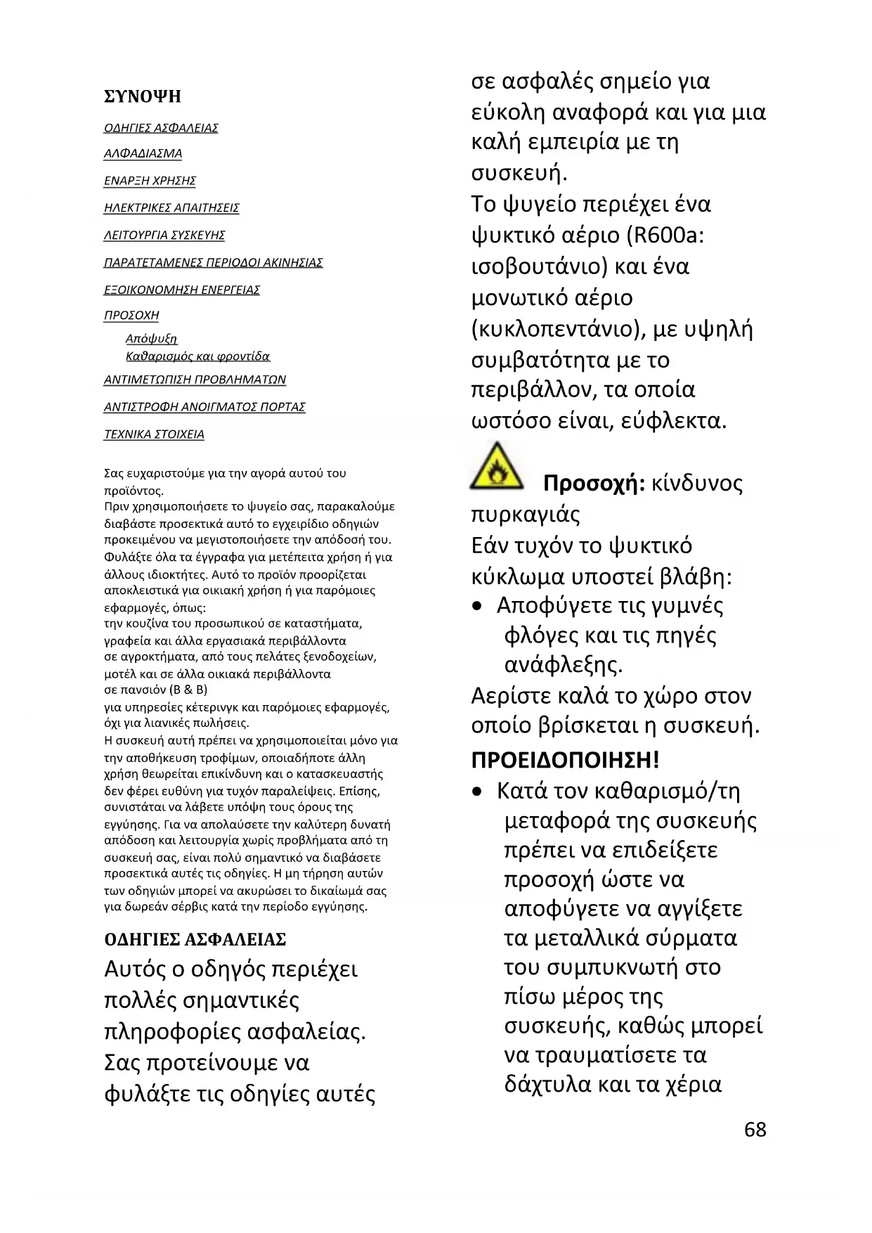 ΟΔΗΓΙΕΣ ΑΣΦΑΛΕΙΑΣ ΑΛΦΑΔΙΑΣΜΑ ΕΝΑΡΞΗ ΧΡΗΣΗΣ ΗΛΕΚΤΡΙΚΕΣ ΑΠΑΙΤΗΣΕΙΣ ΛΕΙΤΟΥΡΓΙΑ ΣΥΣΚΕΥΗΣ ΠΑΡΑΤΕΤΑΜΕΝΕΣ ΠΕΡΙΟΔΟΙ ΑΚΙΝΗΣΙΑΣ ΕΞΟΙΚΟΝΟΜΗΣΗ ΕΝΕΡΓΕΙΑΣ ΠΡΟΣΟΧΗ Απόψυξη Καθαρισμός και φροντίδα ΑΝΤΙΜΕΤΩΠΙΣΗ ΠΡΟΒΛΗΜΑΤΩΝ ΑΝΤΙΣΤΡΟΦΗ ΑΝΟΙΓΜΑΤΟΣ ΠΟΡΤΑΣ ΤΕΧΝΙΚΑ ΣΤΟΙΧΕΙΑ Σας ευχαριστούμε για την αγορά αυτού του προϊόντος. Πριν χρησιμοποιήσετε το ψυγείο σας, παρακαλούμε διαβάστε προσεκτικά αυτό το εγχειρίδιο οδηγιών προκειμένου να μεγιστοποιήσετε την απόδοσή του. Φυλάξτε όλα τα έγγραφα για μετέπειτα χρήση ή για άλλους ιδιοκτήτες. Αυτό το προϊόν προορίζεται αποκλειστικά για οικιακή χρήση ή για παρόμοιες εφαρμογές, όπως: την κουζίνα του προσωπικού σε καταστήματα, γραφεία και άλλα εργασιακά περιβάλλοντα σε αγροκτήματα, από τους πελάτες ξενοδοχείων, μοτέλ και σε άλλα οικιακά περιβάλλοντα σε πανσιόν (B & B) για υπηρεσίες κέτερινγκ και παρόμοιες εφαρμογές, όχι για λιανικές πωλήσεις. Η συσκευή αυτή πρέπει να χρησιμοποιείται μόνο για την αποθήκευση τροφίμων, οποιαδήποτε άλλη χρήση θεωρείται επικίνδυνη και ο κατασκευαστής δεν φέρει ευθύνη για τυχόν παραλείψεις. Επίσης, συνιστάται να λάβετε υπόψη τους όρους της εγγύησης. Για να απολαύσετε την καλύτερη δυνατή απόδοση και λειτουργία χωρίς προβλήματα από τη συσκευή σας, είναι πολύ σημαντικό να διαβάσετε προσεκτικά αυτές τις οδηγίες. Η μη τήρηση αυτών των οδηγιών μπορεί να ακυρώσει το δικαίωμά σας για δωρεάν σέρβις κατά την περίοδο εγγύησης. ΟΔΗΓΙΕΣ ΑΣΦΑΛΕΙΑΣ Αυτός ο οδηγός περιέχει πολλές σημαντικές πληροφορίες ασφαλείας. Σας προτείνουμε να φυλάξτε τις οδηγίες αυτές σε ασφαλές σημείο για εύκολη αναφορά και για μια καλή εμπειρία με τη