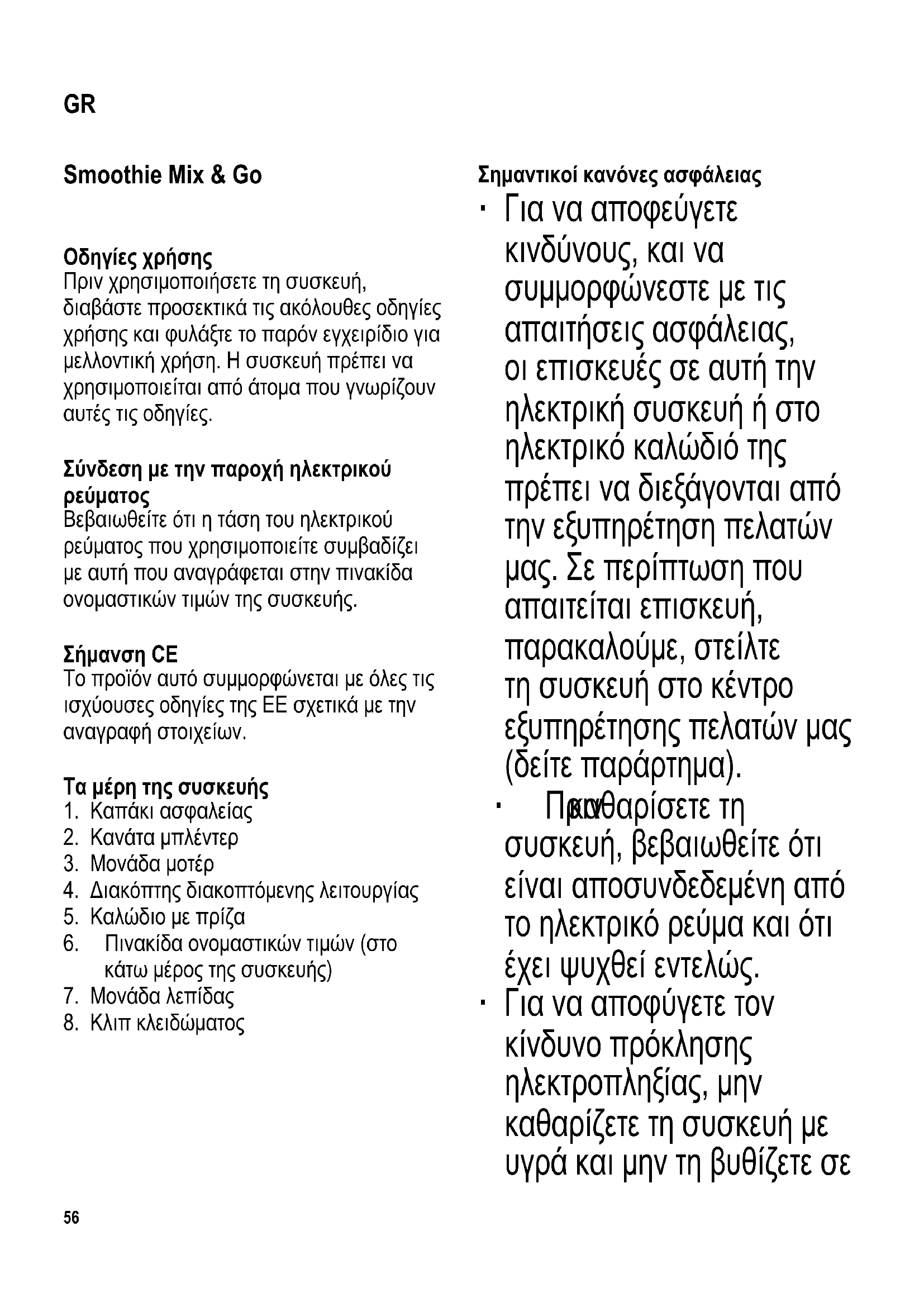 καθαρίσετε τη συσκευή, βεβαιωθείτε ότι είναι αποσυνδεδεμένη από το ηλεκτρικό ρεύμα και ότι έχει ψυχθεί εντελώς. ∙ Για να αποφύγετε τον κίνδυνο πρόκλησης ηλεκτροπληξίας, μην καθαρίζετε τη συσκευή με υγρά και μην τη βυθίζετε σε GR57
