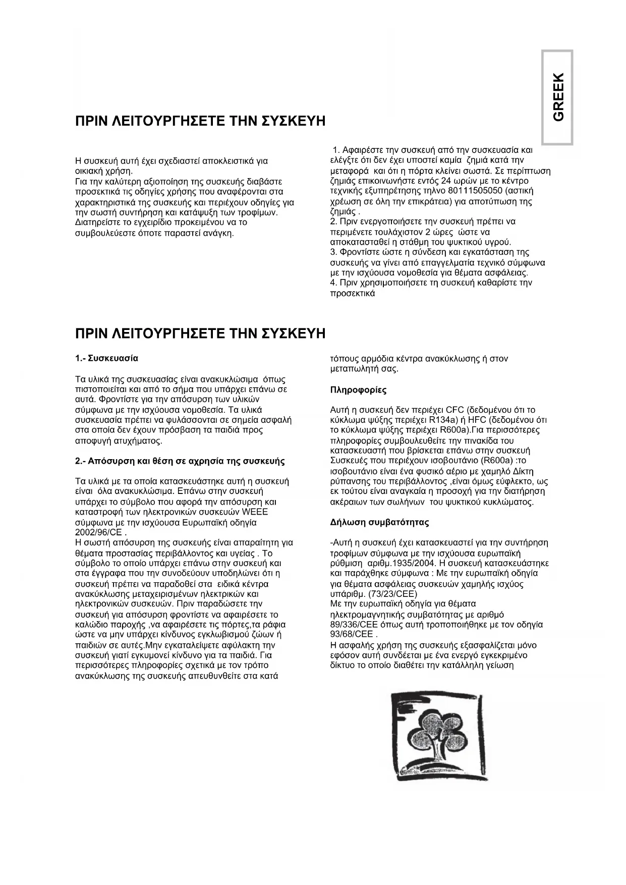 ΠΡΟΣΟΧΗ : Στο τέλος του κύκλου χρήσης της συσκευής αποσύρετε την συσκευή σύµφωνα µε την οδηγία WEEE. Η συσκευή περιέχει το ψυκτικό υγρό R600a και ένα εύφλεκτο αέριο σε µορφή αφρού που χρησιµοποιείται για µόνωση ∆ιαβάστε προσεκτικά τις οδηγίες αυτού του εγχειριδίου, φυλάξτε το βιβλίο ώστε να το συµβουλεύεστε όποτε παραστεί ανάγκη.