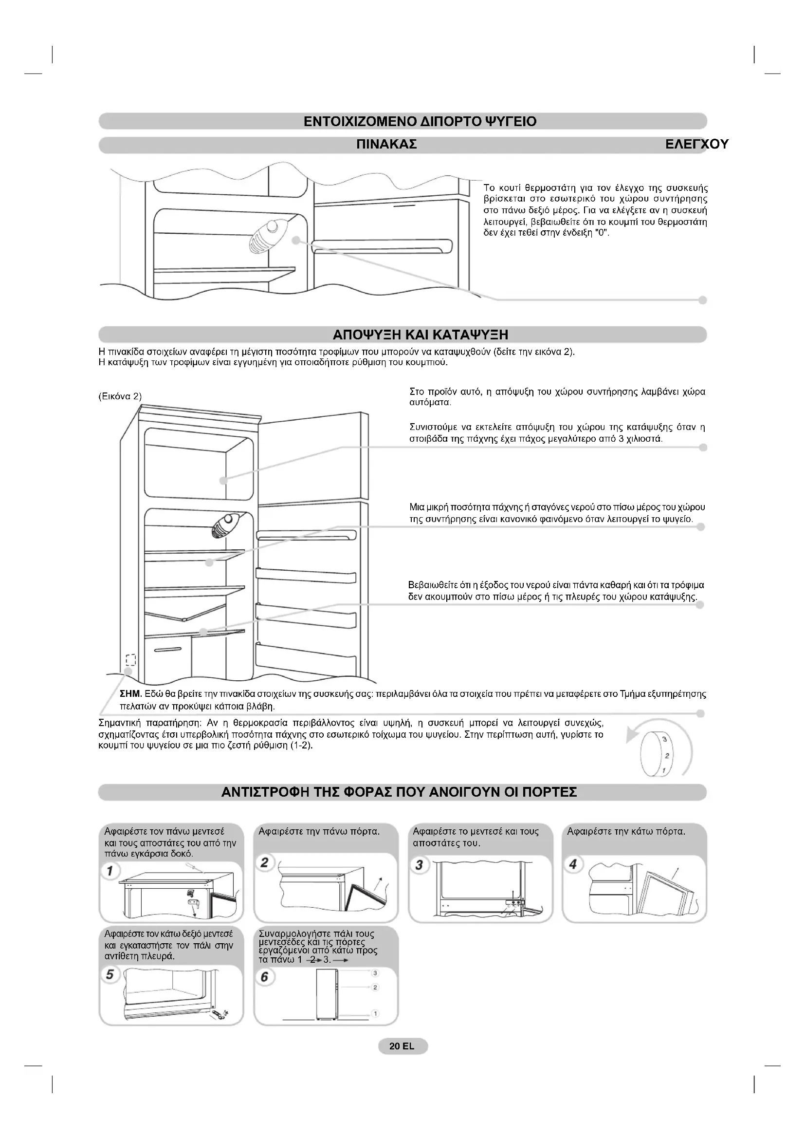 CORRECTO Dimensões dos encaixes das colunas.ΕΝΤΟΙΧΙΖΟΜΕΝΟ ΔΙΠΟΡΤΟ ΨΥΓΕΙΟ ΑΝΤΙΣΤΡΟΦΗ ΤΗΣ ΦΟΡΑΣ ΠΟΥ ΑΝΟΙΓΟΥΝ ΟΙ ΠΟΡΤΕΣ ΠΙΝΑΚΑΣ ΕΛΕΓΧΟΥ Το κουτί θερμοστάτη για τον έλεγχο της συσκευής βρίσκεται στο εσωτερικό του χώρου συντήρησης στο πάνω δεξιό μέρος. Για να ελέγξετε αν η συσκευή λειτουργεί, βεβαιωθείτε ότι το κουμπί του θερμοστάτη δεν έχει τεθεί στην ένδειξη "0". ΑΠΟΨΥΞΗ ΚΑΙ ΚΑΤΑΨΥΞΗ Η πινακίδα στοιχείων αναφέρει τη μέγιστη ποσότητα τροφίμων που μπορούν να καταψυχθούν (δείτε την εικόνα 2). Η κατάψυξη των τροφίμων είναι εγγυημένη για οποιαδήποτε ρύθμιση του κουμπιού. Στο προϊόν αυτό, η απόψυξη του χώρου συντήρησης λαμβάνει χώρα