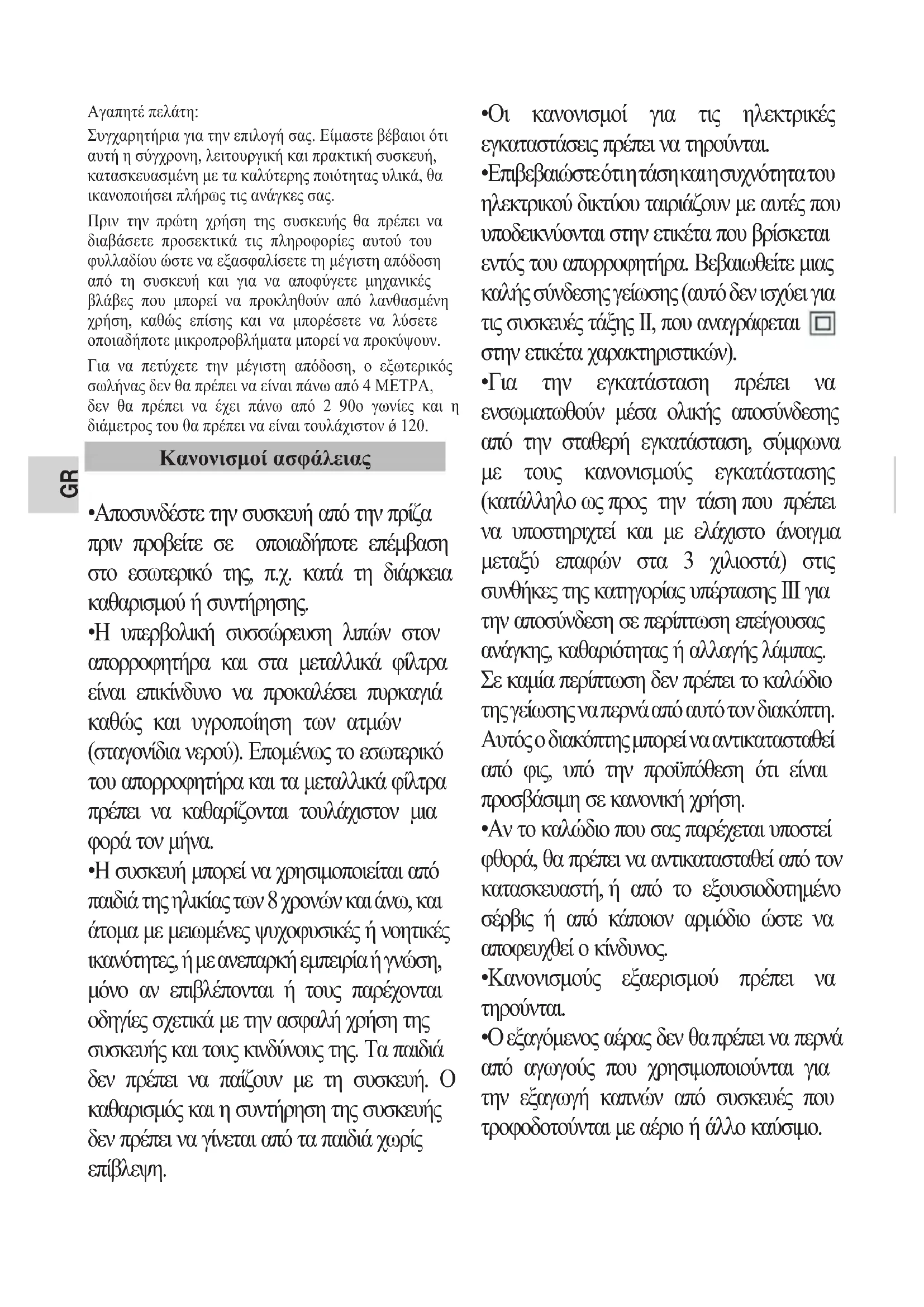 - Ο εξαγόμενος αέρας δεν θα πρέπει να περνά από αγωγούς που χρησιμοποιούνται για την εξαγωγή καπνών από συσκευές που τροφοδοτούνται με αέριο ή άλλο καύσιμο. Κανονισμοί ασφάλειαςGR