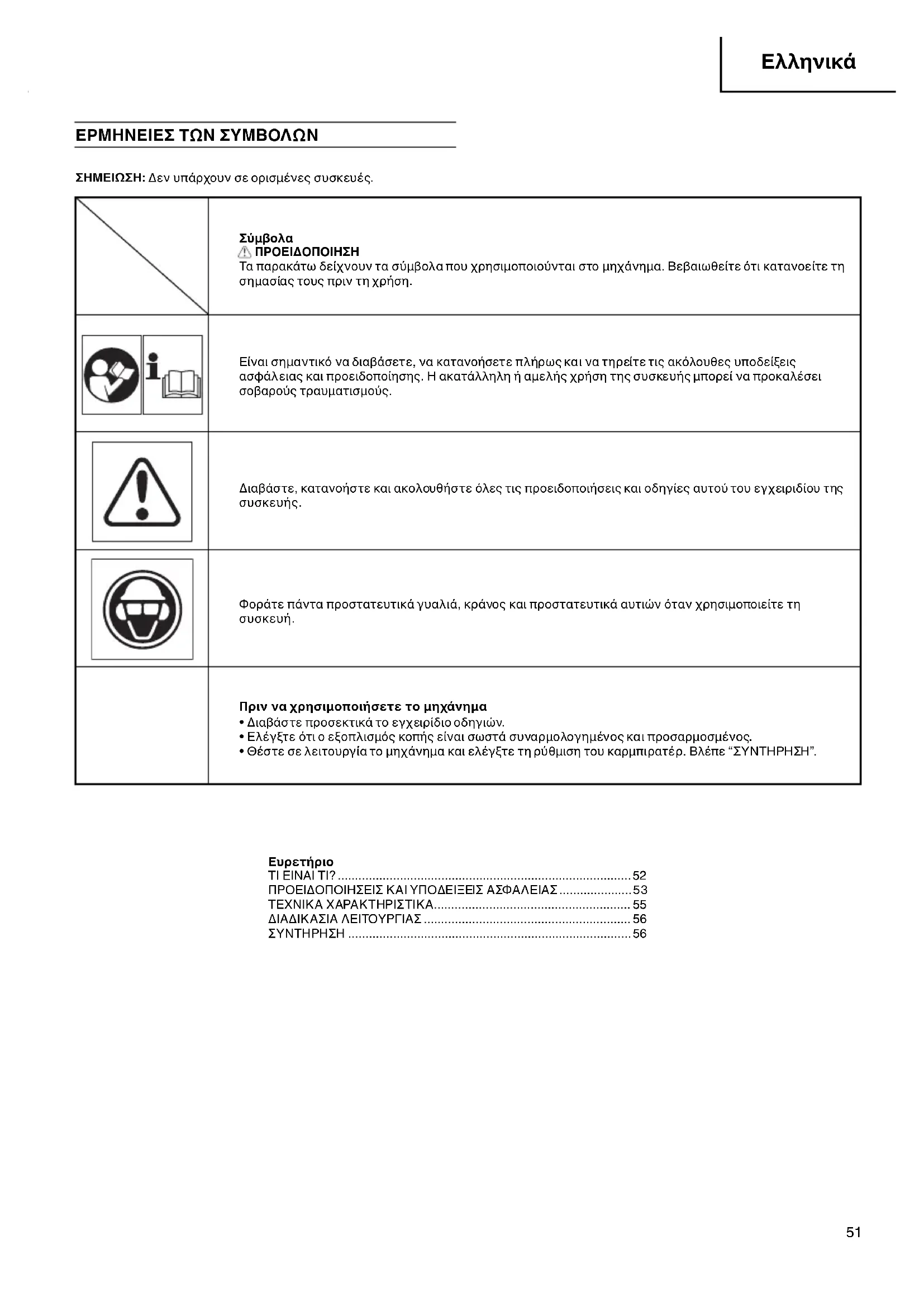 ΠΡΟΕΙΔΟΠΟΙΗΣΗ Τα παρακάτω δείχνουν τα σύμβολα που χρησιμοποιούνται στο μηχάνημα. Βεβαιωθείτε ότι κατανοείτε τη σημασίας τους πριν τη χρήση. Είναι σημαντικό να διαβάσετε, να κατανοήσετε πλήρως και να τηρείτε τις ακόλουθες υποδείξεις ασφάλειας και προειδοποίησης. Η ακατάλληλη ή αμελής χρήση της συσκευής μπορεί να προκαλέσει σοβαρούς τραυματισμούς. Διαβάστε, κατανοήστε και ακολουθήστε όλες τις προειδοποιήσεις και οδηγίες αυτού του εγχειριδίου της