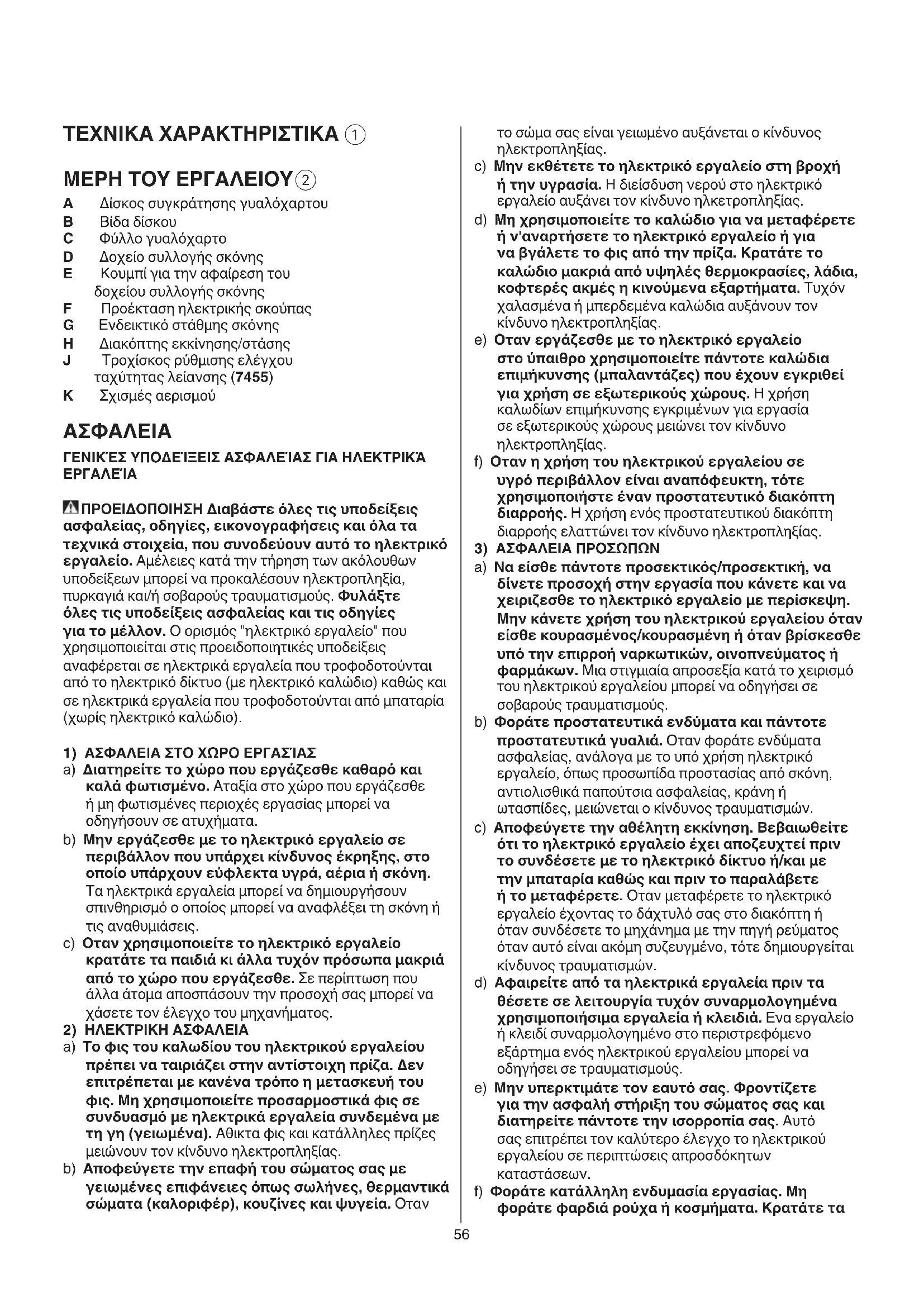 A Δίσκος συγκράτησης γυαλόχαρτου B Βίδα δίσκου C Φύλλο γυαλόχαρτο D Δοχείο συλλογής σκόνης E Κoυµπί για την αφαίρεση τoυ δoχείoυ συλλoγής σκόνης F Προέκταση ηλεκτρικής σκούπας G Ενδεικτικό στάθμης σκόνης H Διακόπτης εκκίνησης/στάσης J Τροχίσκος ρύθμισης ελέγχου ταχύτητας λείανσης (7455) K Σχισμές αερισμού