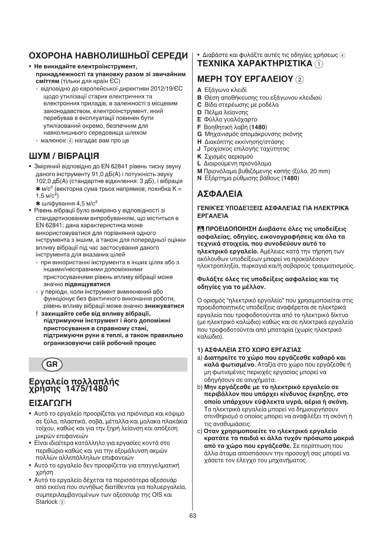 - Οταν λειαίνετε μέταλλα παράγονται σπινθήρες - μη χρησιμοποιείτε την ηλεκτρική σκούπα και απομακρύνετε άλλα άτομα και εύφλεκτα υλικά από τον χώρο εργασίας ΕΠΕΞΗΓΗΣΗ ΤΩΝ ΣΥΜΒΟΛΩΝ ΣΤΟ ΕΡΓΑΛΕΙΟ 3 Αυτό το εργαλείο δέχεται τα περισσότερα αξεσουάρ από εκείνα που συνήθως διατίθενται για πολυεργαλεία, συμπεριλαμβανομένων των αξεσουάρ της OIS και Starlock 4 Διαβάστε το εγχειρίδιο οδηγιών πριν από τη χρήση 5 Διπλή μόνωση (δεν απαιτείται καλώδιο γείωσης) 6 Μην πετάτε το εργαλείο στον κάδο οικιακών απορριμμάτων