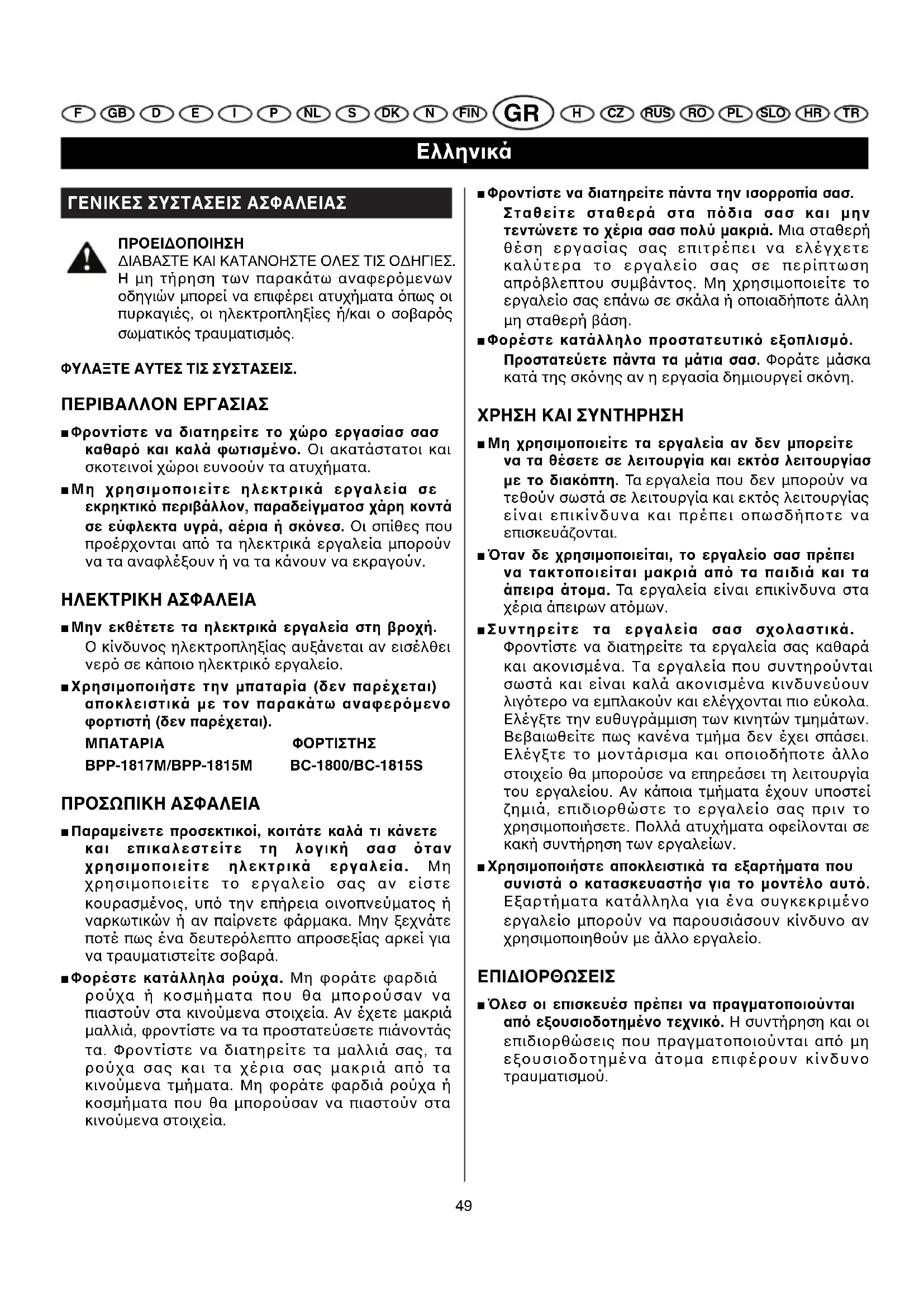 CHV-18WDM manual.qxd 3/05/05 10:56 Page 48ΓΕΝΙΚΕΣ ΣΥΣΤΑΣΕΙΣ ΑΣΦΑΛΕΙΑΣ ΠΡΟΕΙ∆ΟΠΟΙΗΣΗ ∆ΙΑΒΑΣΤΕ ΚΑΙ ΚΑΤΑΝΟΗΣΤΕ ΟΛΕΣ ΤΙΣ Ο∆ΗΓΙΕΣ. Η µη τήρηση των παρακάτω αναφερµενων οδηγιών µπορεί να επιφέρει ατυχήµατα πως οι πυρκαγιές, οι ηλεκτροπληξίες ή/και ο σοβαρς σωµατικς τραυµατισµς. ΦΥΛΑΞΤΕ ΑΥΤΕΣ ΤΙΣ ΣΥΣΤΑΣΕΙΣ. ΠΕΡΙΒΑΛΛΟΝ ΕΡΓΑΣΙΑΣ ■ Φροντίστε να διατηρείτε το χώρο εργασίασ σασ καθαρ και καλά φωτισµένο. Οι ακατάστατοι και σκοτεινοί χώροι ευνοούν τα ατυχήµατα. ■ Μη χρησιµοποιείτε ηλεκτρικά εργαλεία σε εκρηκτικ περιβάλλον, παραδείγµατοσ χάρη κοντά σε εύφλεκτα υγρά, αέρια ή σκνεσ. Οι σπίθες που προέρχονται απ τα ηλεκτρικά εργαλεία µπορούν να τα αναφλέξουν ή να τα κάνουν να εκραγούν. ΗΛΕΚΤΡΙΚΗ ΑΣΦΑΛΕΙΑ ■ Μην εκθέτετε τα ηλεκτρικά εργαλεία στη βροχή. Ο κίνδυνος ηλεκτροπληξίας αυξάνεται αν εισέλθει νερ σε κάποιο ηλεκτρικ εργαλείο. ■ Χρησιµοποιήστε την µπαταρία (δεν παρέχεται) αποκλειστικά µε τον παρακάτω αναφερµενο φορτιστή (δεν παρέχεται). ΜΠΑΤΑΡΙΑ ΦΟΡΤΙΣΤΗΣ BPP-1817M/BPP-1815M BC-1800/BC-1815S ΠΡΟΣΩΠΙΚΗ ΑΣΦΑΛΕΙΑ ■ Παραµείνετε προσεκτικοί, κοιτάτε καλά τι κάνετε και επικαλεστείτε τη λογική σασ ταν χρησιµοποιείτε ηλεκτρικά εργαλεία. Μη χρησιµοποιείτε το εργαλείο σας αν είστε κουρασµένος, υπ την επήρεια οινοπνεύµατος ή ναρκωτικών ή αν παίρνετε φάρµακα. Μην ξεχνάτε ποτέ πως ένα δευτερλεπτο απροσεξίας αρκεί για να τραυµατιστείτε σοβαρά. ■ Φορέστε κατάλληλα ρούχα. Μη φοράτε φαρδιά ρούχα ή κοσµήµατα που θα µπορούσαν να πιαστούν στα κινούµενα στοιχεία. Αν έχετε µακριά µαλλιά, φροντίστε να τα προστατεύσετε πιάνοντάς τα. Φροντίστε να διατηρείτε τα µαλλιά σας, τα ρούχα σας και τα χέρια σας µακριά απ τα κινούµενα τµήµατα. Μη φοράτε φαρδιά ρούχα ή κοσµήµατα που θα µπορούσαν να πιαστούν στα κινούµενα στοιχεία. ■ Φροντίστε να διατηρείτε πάντα την ισορροπία σασ. Σταθείτε σταθερά στα πδια σασ και µην τεντώνετε το χέρια σασ πολύ µακριά. Μια σταθερή θέση εργασίας σας επιτρέπει να ελέγχετε καλύτερα το εργαλείο σας σε περίπτωση απρβλεπτου συµβάντος. Μη χρησιµοποιείτε το εργαλείο σας επάνω σε σκάλα ή οποιαδήποτε άλλη µη σταθερή βάση. ■ Φορέστε κατάλληλο προστατευτικ εξοπλισµ. Προστατεύετε πάντα τα µάτια σασ. Φοράτε µάσκα κατά της σκνης αν η εργασία δηµιουργεί σκνη. ΧΡΗΣΗ ΚΑΙ ΣΥΝΤΗΡΗΣΗ ■ Μη χρησιµοποιείτε τα εργαλεία αν δεν µπορείτε να τα θέσετε σε λειτουργία και εκτσ λειτουργίασ µε το διακπτη. Τα εργαλεία που δεν µπορούν να τεθούν σωστά σε λειτουργία και εκτς λειτουργίας είναι επικίνδυνα και πρέπει οπωσδήποτε να επισκευάζονται. ■ ταν δε χρησιµοποιείται, το εργαλείο σασ πρέπει να τακτοποιείται µακριά απ τα παιδιά και τα άπειρα άτοµα. Τα εργαλεία είναι επικίνδυνα στα χέρια άπειρων ατµων. ■ Συντηρείτε τα εργαλεία σασ σχολαστικά. Φροντίστε να διατηρείτε τα εργαλεία σας καθαρά και ακονισµένα. Τα εργαλεία που συντηρούνται σωστά και είναι καλά ακονισµένα κινδυνεύουν λιγτερο να εµπλακούν και ελέγχονται πιο εύκολα. Ελέγξτε την ευθυγράµµιση των κινητών τµηµάτων. Βεβαιωθείτε πως κανένα τµήµα δεν έχει σπάσει. Ελέγξτε το µοντάρισµα και οποιοδήποτε άλλο στοιχείο θα µπορούσε να επηρεάσει τη λειτουργία του εργαλείου. Αν κάποια τµήµατα έχουν υποστεί ζηµιά, επιδιορθώστε το εργαλείο σας πριν το χρησιµοποιήσετε. Πολλά ατυχήµατα οφείλονται σε κακή συντήρηση των εργαλείων. ■ Χρησιµοποιήστε αποκλειστικά τα εξαρτήµατα που συνιστά ο κατασκευαστήσ για το µοντέλο αυτ. Εξαρτήµατα κατάλληλα για ένα συ