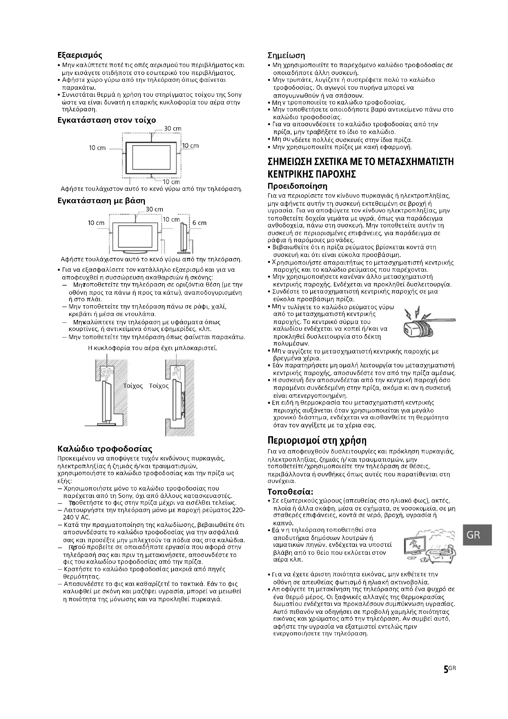 ους προστασίας και ασφάλειας του προϊόντος, η Sony συνιστά ένθερμα η εγκατάσταση της τηλεόρασής σας να πραγματοποιείται από αντιπροσώπους της Sony ή εξουσιοδοτημένους τεχνικούς. Μην επιχειρήσετε να την εγκαταστήσετε μόνοι σας.