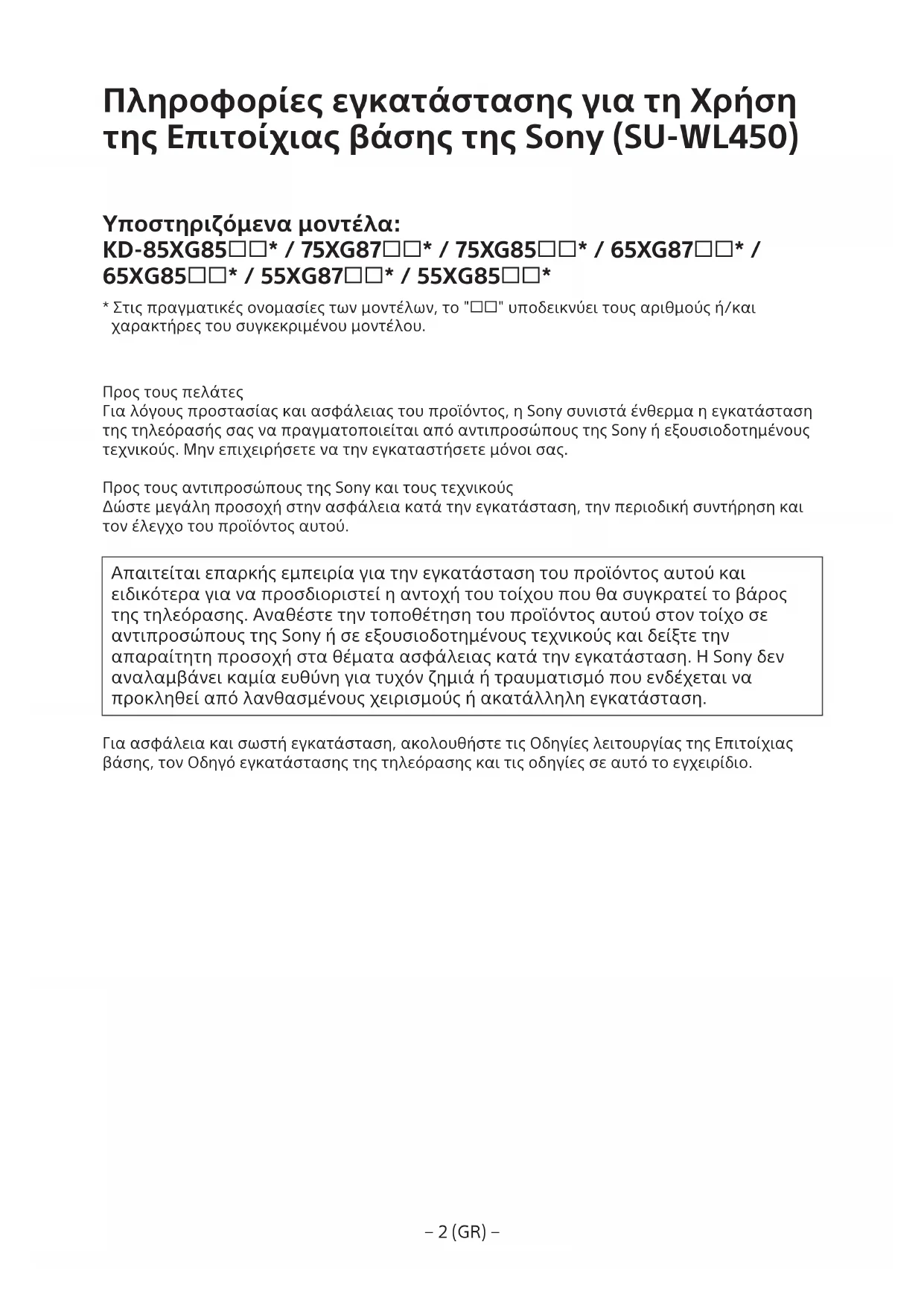 - Στις πραγματικές ονομασίες των μοντέλων, το "" υποδεικνύει τους αριθμούς ή/και χαρακτήρες του συγκεκριμένου μοντέλου. Προς τους πελάτες Για λόγους προστασίας και ασφάλειας του προϊόντος, η Sony συνιστά ένθερμα η εγκατάσταση της τηλεόρασής σας να πραγματοποιείται από αντιπροσώπους της Sony ή εξουσιοδοτημένους τεχνικούς. Μην επιχειρήσετε να την εγκαταστήσετε μόνοι σας. Προς τους αντιπροσώπους της Sony και τους τεχνικούς Δώστε μεγάλη προσοχή στην ασφάλεια κατά την εγκατάσταση, την περιοδική συντήρηση και τον έλεγχο του προϊόντος αυτού. Απαιτείται επαρκής εμπειρία για την εγκατάσταση του προϊόντος αυτού και ειδικότερα για να προσδιοριστεί η αντοχή του τοίχου που θα συγκρατεί το βάρος της τηλεόρασης. Αναθέστε την τοποθέτηση του προϊόντος αυτού στον τοίχο σε αντιπροσώπους της Sony ή σε εξουσιοδοτημένους τεχνικούς και δείξτε την απαραίτητη προσοχή στα θέματα ασφάλειας κατά την εγκατάσταση. Η Sony δεν αναλαμβάνει καμία ευθύνη για τυχόν ζημιά ή τραυματισμό που ενδέχεται να προκληθεί από λανθασμένους χειρισμούς ή ακατάλληλη εγκατάσταση. Για ασφάλεια και σωστή εγκατάσταση, ακολουθήστε τις Οδηγίες λειτουργίας της Επιτοίχιας βάσης, τον Οδηγό εγκατάστασης της τηλεόρασης και τις οδηγίες σε αυτό το εγχειρίδιο.− 3 (GR) −