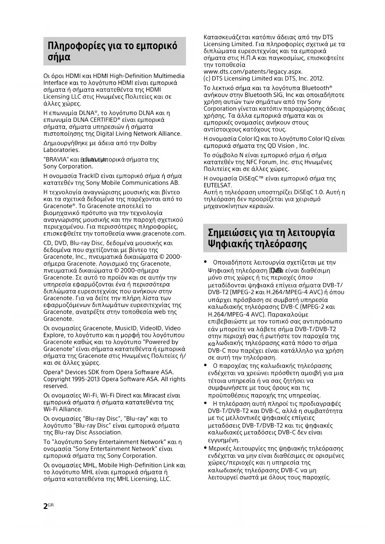 Οι όροι HDMI και HDMI High-Definition Multimedia Interface και το λογότυπο HDMI είναι εμπορικά σήματα ή σήματα κατατεθέντα της HDMI Licensing LLC στις Ηνωμένες Πολιτείες και σε άλλες χώρες. Η επωνυμία DLNA®, το λογότυπο DLNA και η επωνυμία DLNA CERTIFIED® είναι εμπορικά σήματα, σήματα υπηρεσιών ή σήματα πιστοποίησης της Digital Living Network Alliance. Δημιουργήθηκε με άδεια από την Dolby Laboratories. "BRAVIA" και είναι εμπορικά σήματα της Sony Corporation. Η ονομασία TrackID είναι εμπορικό σήμα ή σήμα κατατεθέν της Sony Mobile Communications AB. Η τεχνολογία αναγνώρισης μουσικής και βίντεο και τα σχετικά δεδομένα της παρέχονται από το Gracenote®. Το Gracenote αποτελεί το βιομηχανικό πρότυπο για την τεχνολογία αναγνώρισης μουσικής και την παροχή σχετικού περιεχομένου. Για περισσότερες πληροφορίες, επισκεφθείτε την τοποθεσία www.gracenote.com. CD, DVD, Blu-ray Disc, δεδομένα μουσικής και δεδομένα που σχετίζονται με βίντεο της Gracenote, Inc., πνευματικά δικαιώματα © 2000- σήμερα Gracenote. Λογισμικό της Gracenote, πνευματικά δικαιώματα © 2000-σήμερα Gracenote. Σε αυτό το προϊόν και σε αυτήν την υπηρεσία εφαρμόζονται ένα ή περισσότερα διπλώματα ευρεσιτεχνίας που ανήκουν στην Gracenote. Για να δείτε την πλήρη λίστα των εφαρμοζόμενων διπλωμάτων ευρεσιτεχνίας της Gracenote, ανατρέξτε στην τοποθεσία web της Gracenote. Οι ονομασίες Gracenote, MusicID, VideoID, Video Explore, το λογότυπο και η μορφή του λογότυπου Gracenote καθώς και το λογότυπο "Powered by Gracenote" είναι σήματα κατατεθέντα ή εμπορικά σήματα της Gracenote στις Ηνωμένες Πολιτείες ή/ και σε άλλες χώρες. Opera® Devices SDK from Opera Software ASA. Copyright 1995-2013 Opera Software ASA. All rights reserved. Οι ονομασίες Wi-Fi, Wi-Fi Direct και Miracast είναι εμπορικά σήματα ή σήματα κατατεθέντα της Wi-Fi Alliance. Οι ονομασίες "Blu-ray Disc", "Blu-ray" και το λογότυπο "Blu-ray Disc" είναι εμπορικά σήματα της Blu-ray Disc Association. Το "λογότυπο Sony Entertainment Network" και η ονομασία "Sony Entertainment Network" είναι εμπορικά σήματα της Sony Corporation. Οι ονομασίες MHL, Mobile High-Definition Link και το λογότυπο MHL είναι εμπορικά σήματα ή σήματα κατατεθέντα της MHL Licensing, LLC. Κατασκευάζεται κατόπιν άδειας από την DTS Licensing Limited. Για πληροφορίες σχετικά με τα διπλώματα ευρεσιτεχνίας και τα εμπορικά σήματα στις Η.Π.Α και παγκοσμίως, επισκεφτείτε την τοποθεσία www.dts.com/patents/legacy.aspx. (c) DTS Licensing Limited και DTS, Inc. 2012. Το λεκτικό σήμα και τα λογότυπα Bluetooth® ανήκουν στην Bluetooth SIG, Inc και οποιαδήποτε χρήση αυτών των σημάτων από την Sony Corporation γίνεται κατόπιν παραχώρησης άδειας χρήσης. Τα άλλα εμπορικά σήματα και οι εμπορικές ονομασίες ανήκουν στους αντίστοιχους κατόχους τους. Η ονομασία Color IQ και το λογότυπο Color IQ είναι εμπορικά σήματα της QD Vision , Inc. Το σύμβολο N είναι εμπορικό σήμα ή σήμα κατατεθέν της NFC Forum, Inc. στις Ηνωμένες Πολιτείες και σε άλλες χώρες. Η ονομασία DiSEqC™ είναι εμπορικό σήμα της EUTELSAT. Αυτή η τηλεόραση υποστηρίζει DiSEqC 1.0. Αυτή η τηλεόραση δεν προορίζεται για χειρισμό μηχανοκίνητων κεραιών. Οποιαδήποτε λειτουργία σχετίζεται με την Ψηφιακή τηλεόραση ( ) θα είναι διαθέσιμη μόνο στις χώρες ή τις περιοχές όπου μεταδίδονται ψηφιακά επίγεια σήματα DVB-T/ DVB-T2 (MPEG-2 και H.264/MPEG-4 AVC) ή όπου υπάρχει πρόσβαση σε συμβατή υπηρεσία καλωδιακής τηλεόρασης DVB-C (MPEG-2 και H.264/MPEG-4 AVC). Παρακαλούμε επιβεβαιώστε με τον τοπικό σας αντιπρόσωπο εάν μπορείτε να λάβετε σήμα DVB-T/DVB-T2 στην περιοχή σας ή ρωτήστε τον παροχέα της